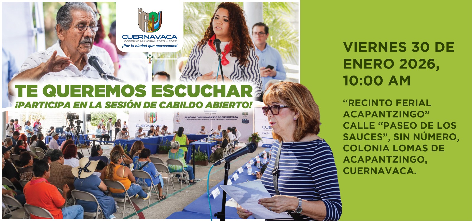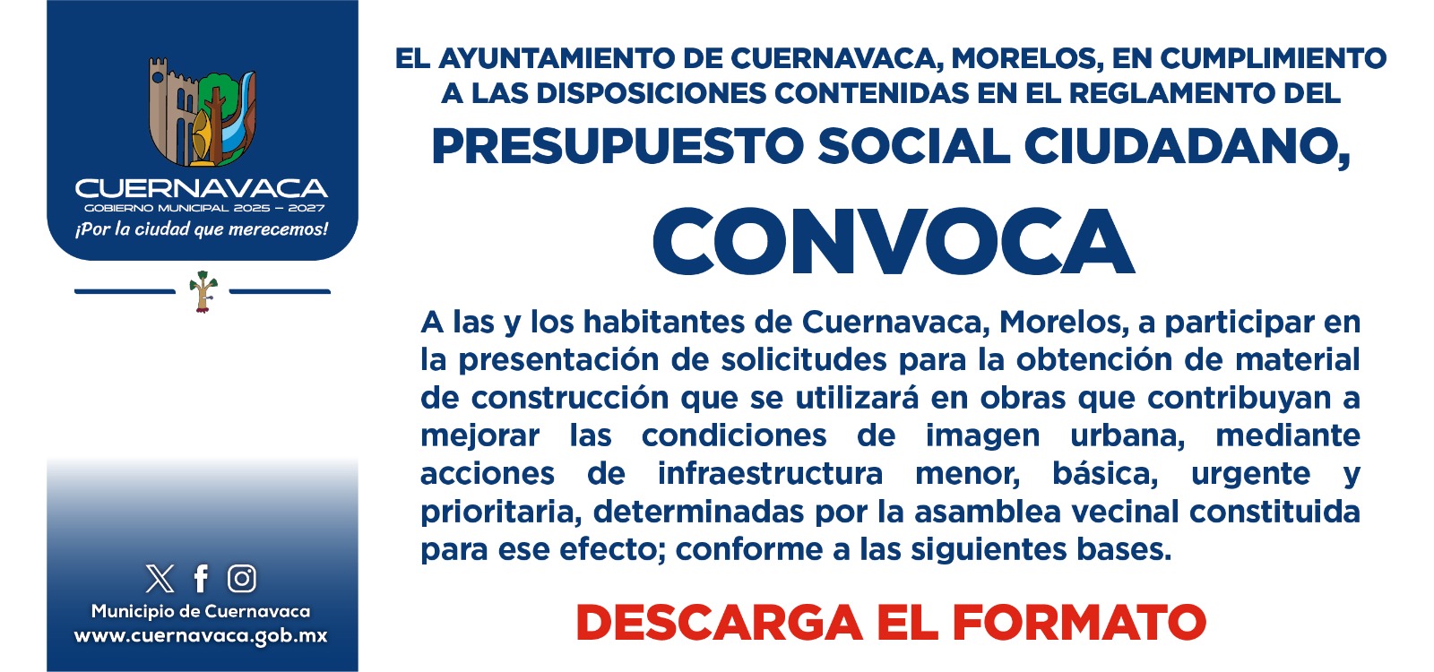 Hoy más que nunca, sumando esfuerzos y voluntades tenemos la oportunidad de hacer que nuestra ciudad renazca del caos y el abandono, entre todas y todos podemos lograr que nuestra querida Cuernavaca sea una tierra fértil y prospera, donde nuestros hijos vivan seguros y plenitud, el turismo resurja y quienes nos visitan se lleven un grato recuerdo en sus memorias, un lugar donde vivamos en armonía con respeto a la naturaleza, nos sintámonos orgullosos de la herencia histórica de nuestros 12 pueblos, nuestras raíces y cultura.