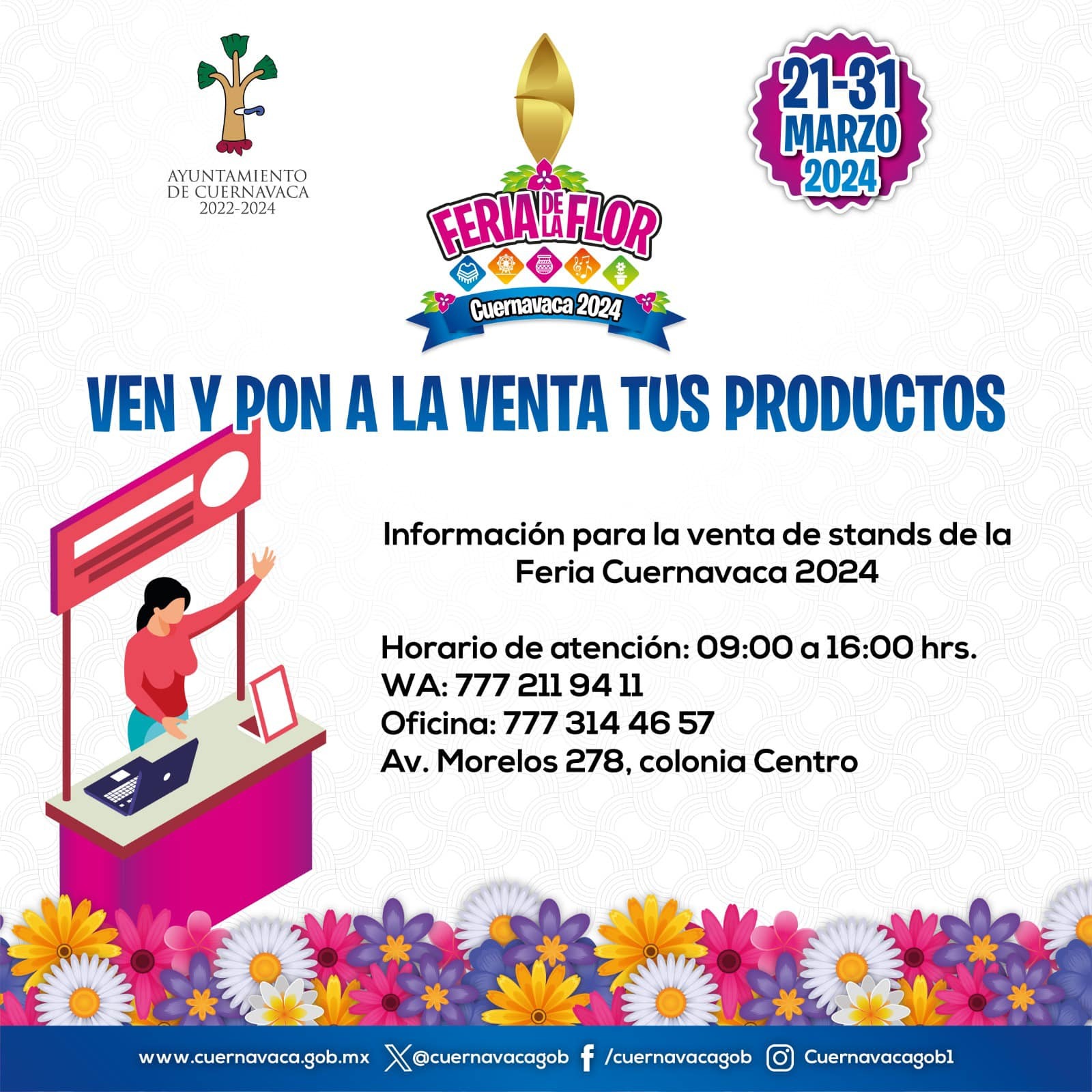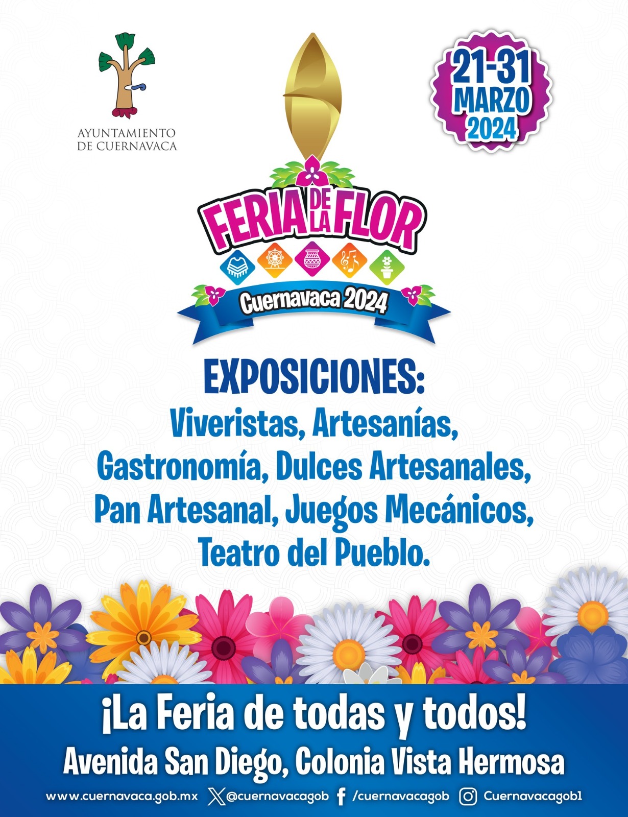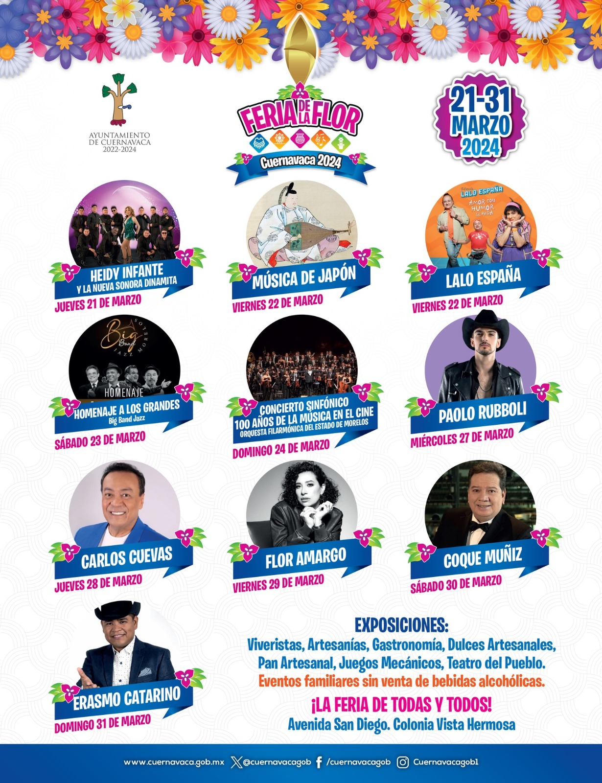 Las personas interesadas en conocer la cartelera y actividades que ofrecerá la Feria de la Flor, Cuernavaca 2024 deben ingresar a las redes sociales y página oficial del Municipio de Cuernavaca https://cuernavaca.gob.mx/
