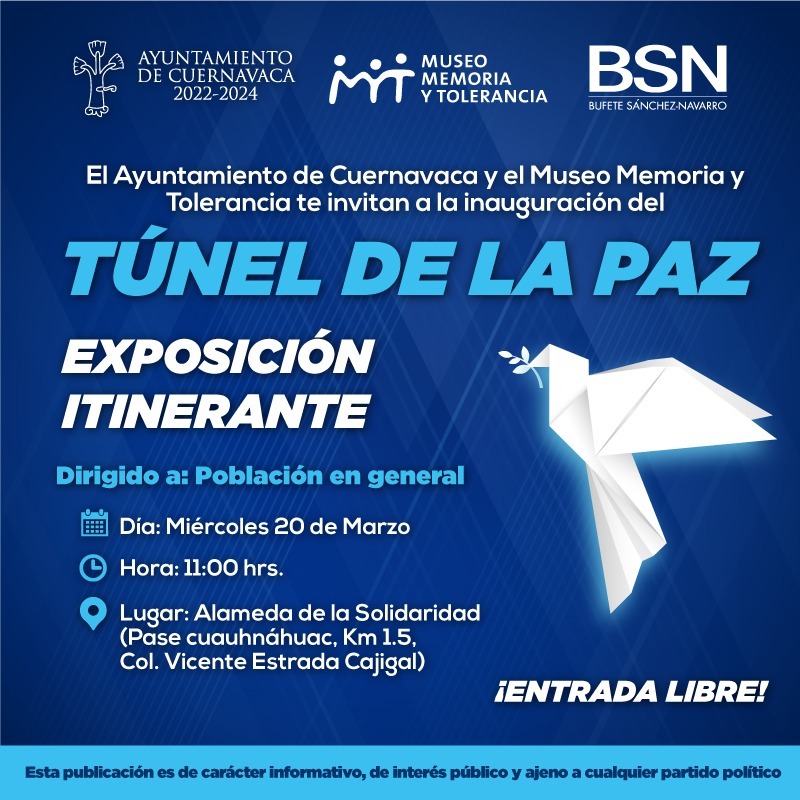 El proyecto integral “Túnel de Paz” recorrerá 15 ciudades del país, siendo Cuernavaca de las primeras en donde la ciudadanía y visitantes podrán acceder a esta exhibición como una herramienta de educación informal para incluirse en los diversos programas sociales y de gobierno.