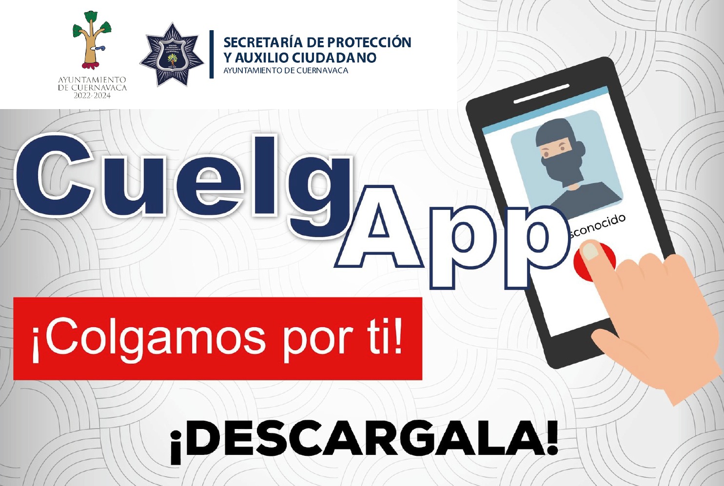 Además de descargar de manera gratuita la aplicación “CuelgApp, Colgamos por ti” para teléfonos iOS y Android, desarrollada, diseñada y ejecutada por la Secretaría de Seguridad Pública Municipal de Querétaro, quien la donó al municipio como parte de la alianza estratégica que se mantiene entre las administraciones municipales de Cuernavaca y de Querétaro.