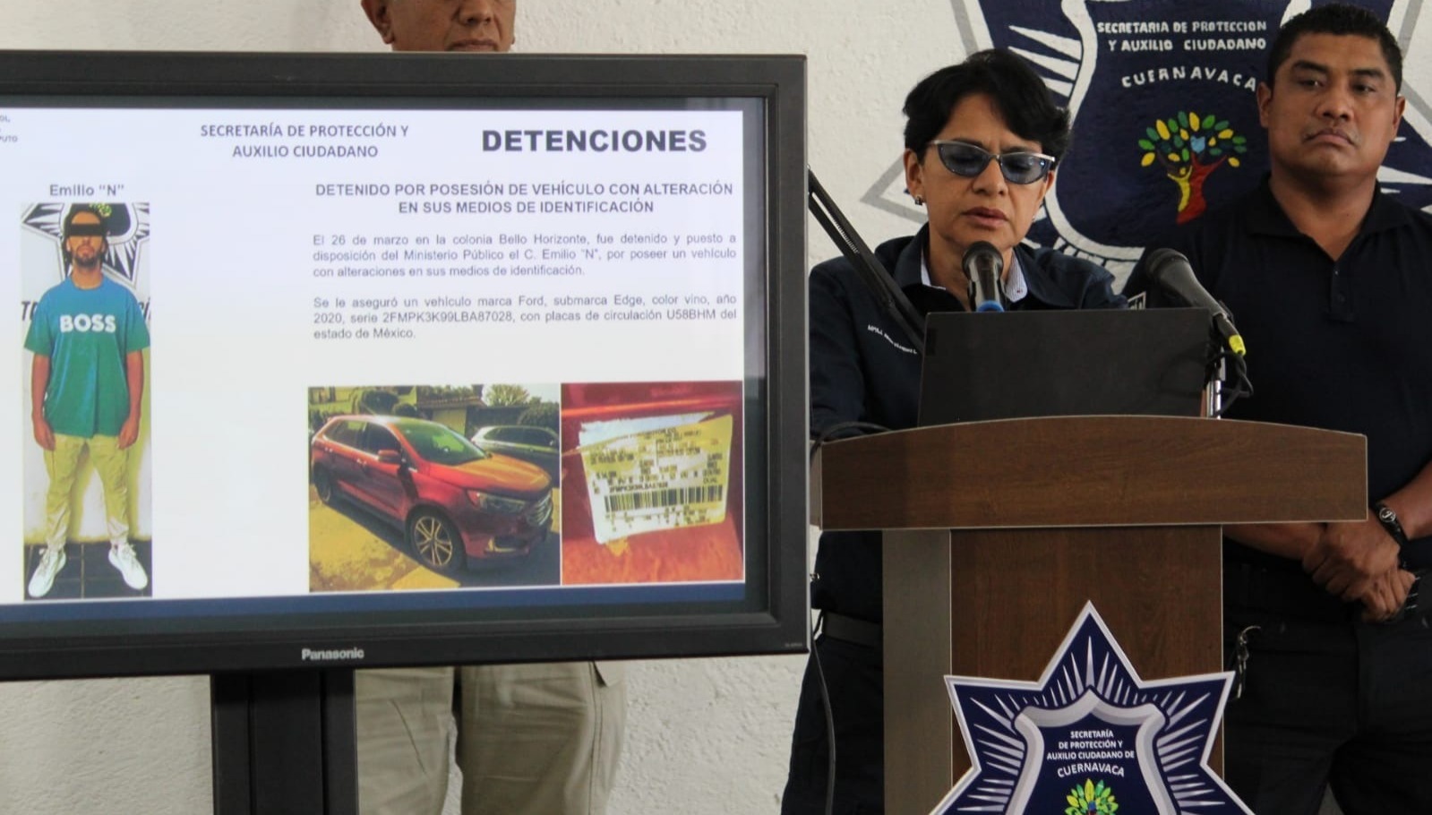 Señaló del 01 de enero al 31 de marzo de 2024 la Unidad de Prevención al Robo de Vehículo (UPRV) ha recuperado 58 vehículos y puesto a disposición del Ministerio Público a 20 personas, dentro de estas cifras se encuentra la detención de Emilio “N” el pasado 26 de marzo en la colonia Bello Horizonte por poseer un vehículo con alteraciones en sus medios de identificación, a quien se le aseguró un vehículo marca Ford, submarca Edge, color vino, año 2020, serie 2FMPK3K99LBA87028, con placas de circulación U58BHM del Estado de México.