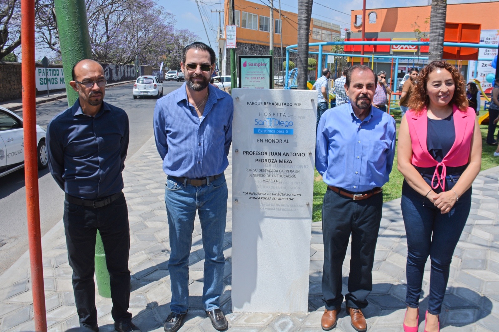 Acompañado del Dr. Juan Antonio Pedroza Franco, director médico del Hospital San Diego y de colaboradores del centro médico, refirió que el parque recibe el nombre del Profesor Juan Antonio Pedroza Meza, alumno fundador y docente de la Benemérita Escuela Secundaria Nº 1 “Profr. Froylán Parroquín García”, por su destacada carrera en beneficio de la educación morelense.