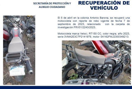En este sentido, el director de Policía Vial, Javier Tencle Santiago, señaló que, del 01 al 07 de abril de 2024 a través del operativo “moto segura”, inspeccionaron de manera aleatoria a estos automotores, recuperando una motocicleta marca Veloci, RT150 CC, color negra, año 2023, serie 3VMA2E3C7P2141979, motor SK162FMJ2300349213 que fue ubicada en la colonia Antonio Barona el 05 de abril y que contaba con reporte de robo vigente de fecha 07 de septiembre de 2023 relacionado con la carpeta de investigación FRV01/2243/2023.