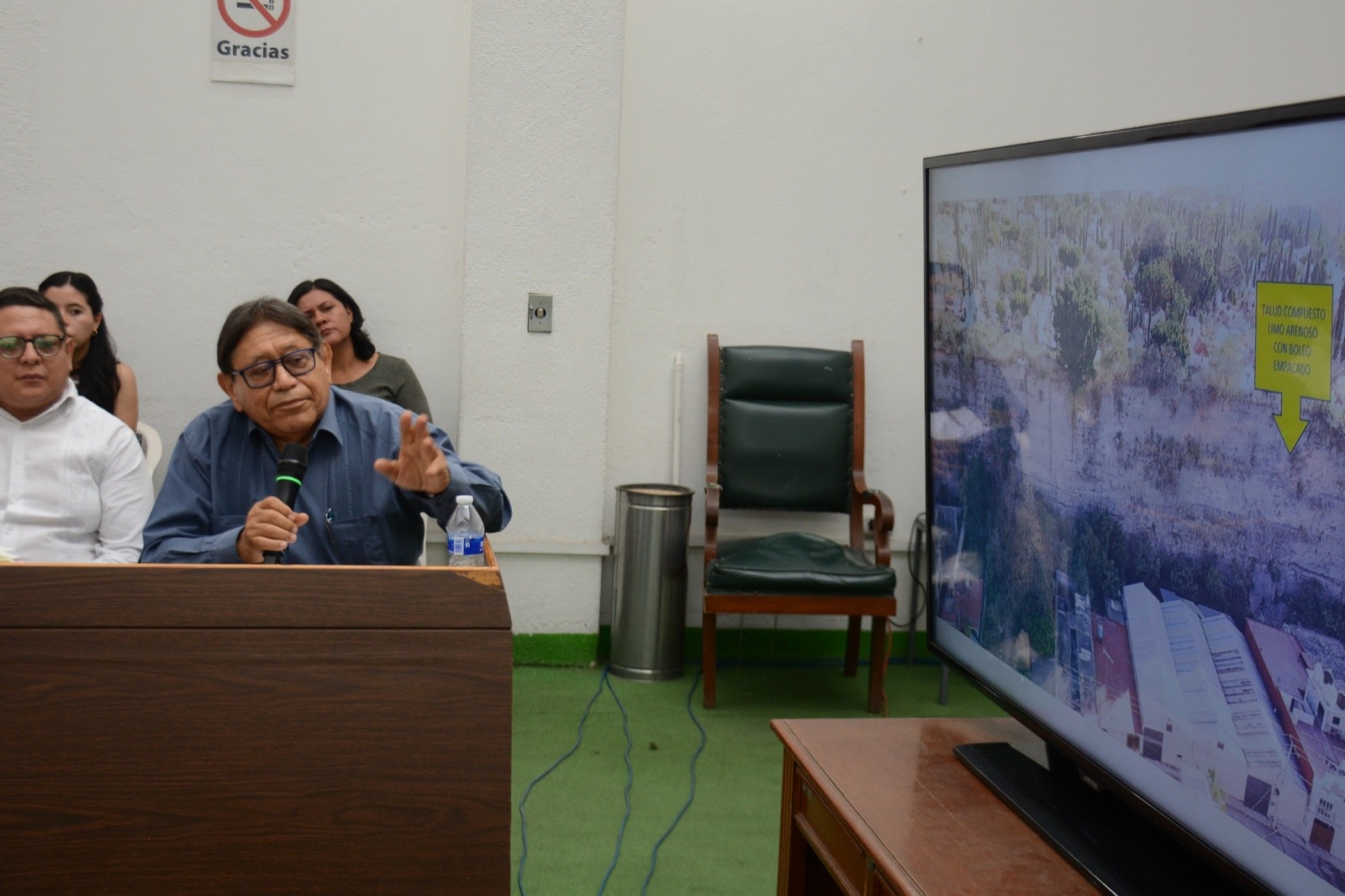 Entre los puntos planteados en el proyecto que será turnado al Cabildo para su revisión y valoración se destacó la colocación de drenes entre 10 y 12 metros que obligarán a que el agua del subsuelo salga por estos dispositivos y la construcción de una zanja para que el agua superficial que escurra sea dirigida hacia la calle, mientras que el agua del subsuelo sea dirigida a través de los drenes, siendo fundamental limpiar el talud para estabilizarlo.