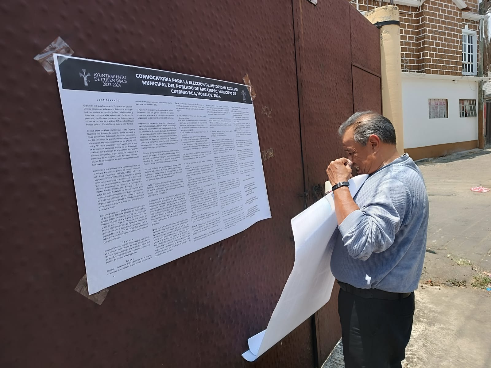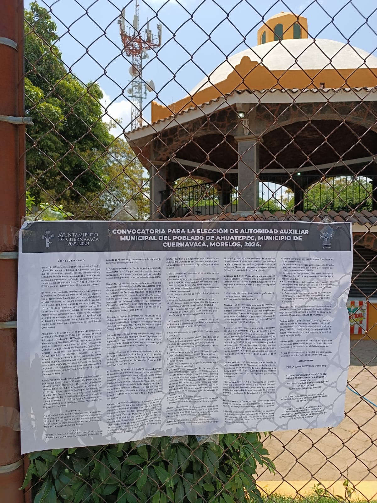 De acuerdo con la convocatoria aprobada por integrantes del Cabildo capitalino, a partir del 11 de abril el Ayuntamiento de Cuernavaca ha publicado en redes sociales oficiales, edificios públicos, medios de mayor difusión en el estado y a través de un perifoneo en español y náhuatl al interior del poblado la convocatoria para la elección extraordinaria de las autoridades auxiliares del poblado de Ahuatepec que se realizará el domingo 28 de abril del presente año.