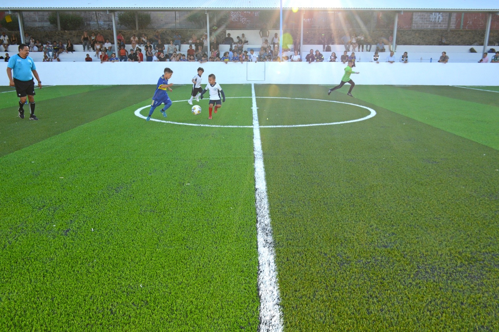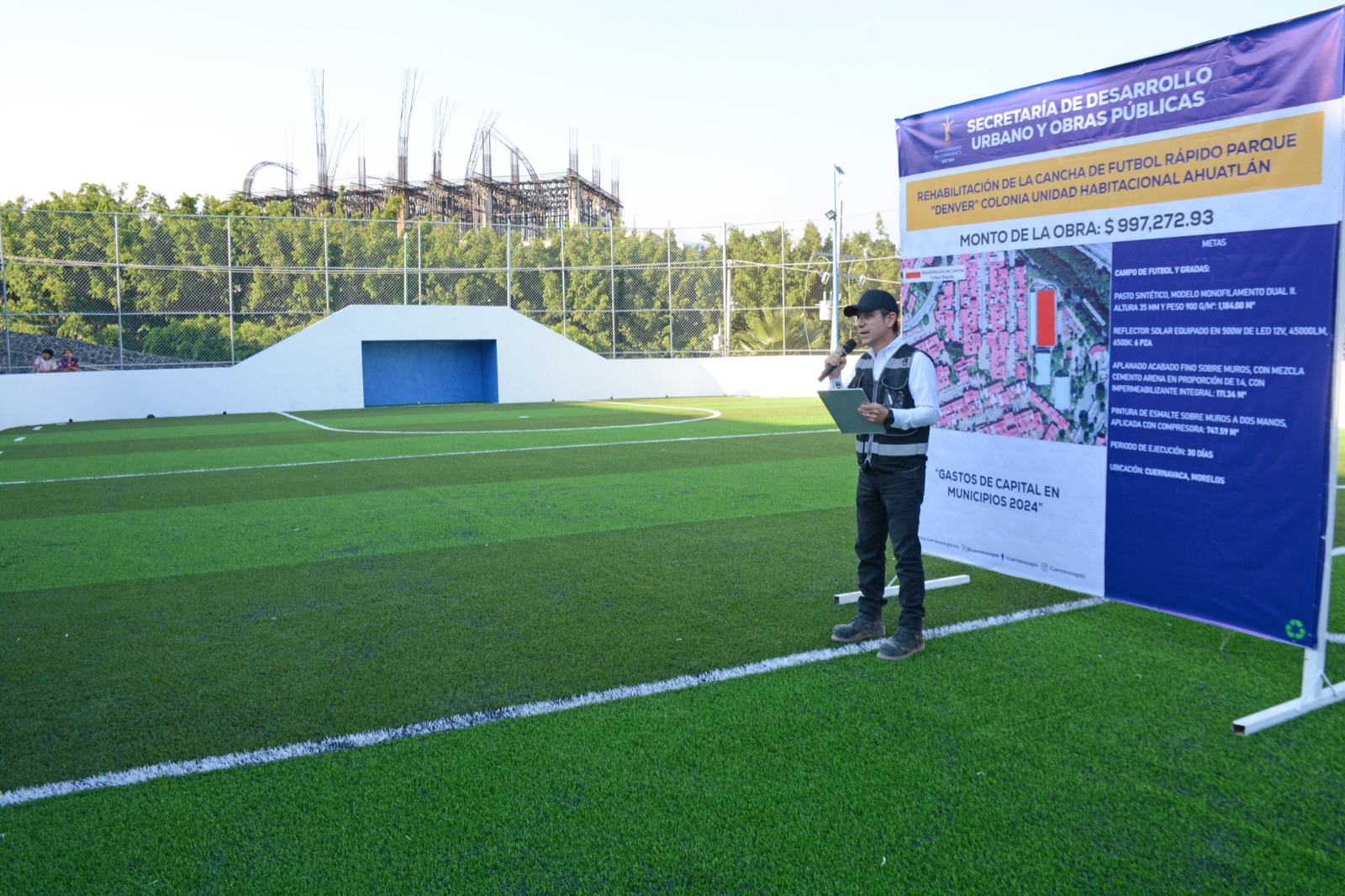 La obra que da respuesta a peticiones hechas por los vecinos y deportistas, se realizó en 30 días e implicó una inversión de 997 mil 272.93 pesos proveniente del fondo de gastos de capital municipal 2024, contemplando como metas la instalación de pasto sintético modelo monofilamento dual II a una altura de 35 milímetros y un peso de 900 G/M2 en mil 184 metros cuadrados.