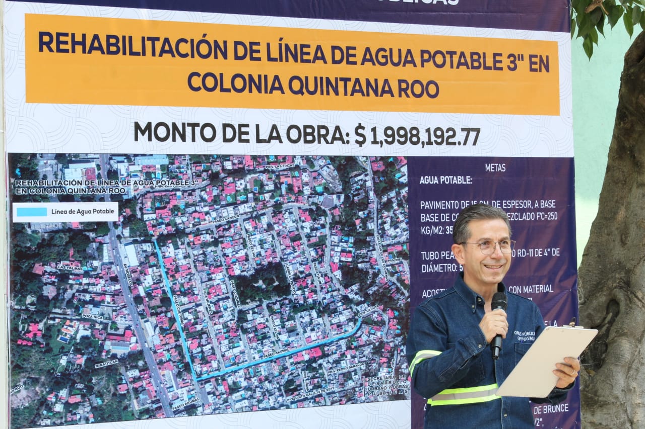 En atención a peticiones ciudadanas, el Ayuntamiento de Cuernavaca, a través de la Secretaría de Desarrollo Urbano y Obras Públicas, inicio con la rehabilitación de la línea de agua potable de tres pulgadas en la colonia Quintana Roo que abarcará calle Paseo Chetumal a calle Paseo Akumal hasta llegar a la privada La Joya, a fin de fortalecer el servicio de distribución de agua potable que se traducirá en una mejor calidad de vida.