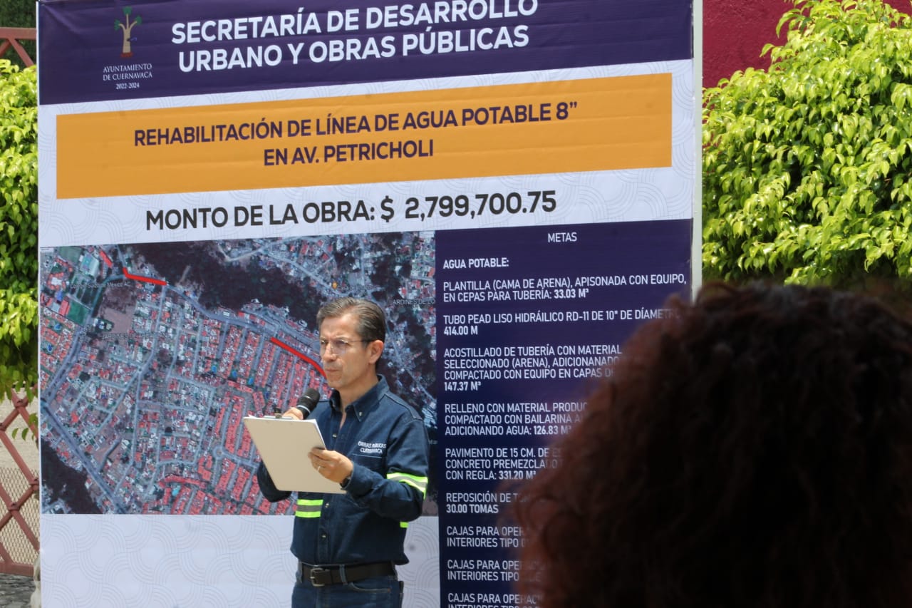 En presencia de vecinos y comerciantes de la zona, el Ayuntamiento de Cuernavaca, a través de la Secretaría de Desarrollo Urbano y Obras Públicas, dio inicio a las labores de rehabilitación de la nueva línea de agua potable de ocho pulgadas en calle Gustavo Petriccioli de la colonia Lomas de Ahuatlán que forma parte de la segunda etapa de intervención en esta arteria.