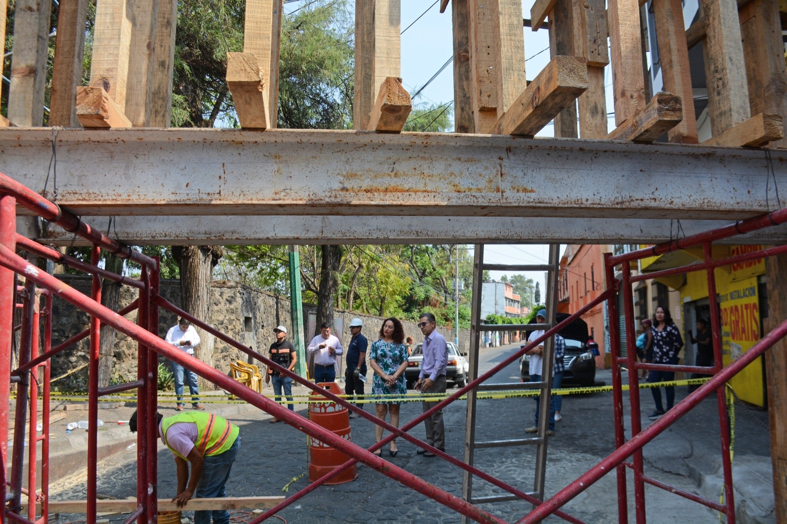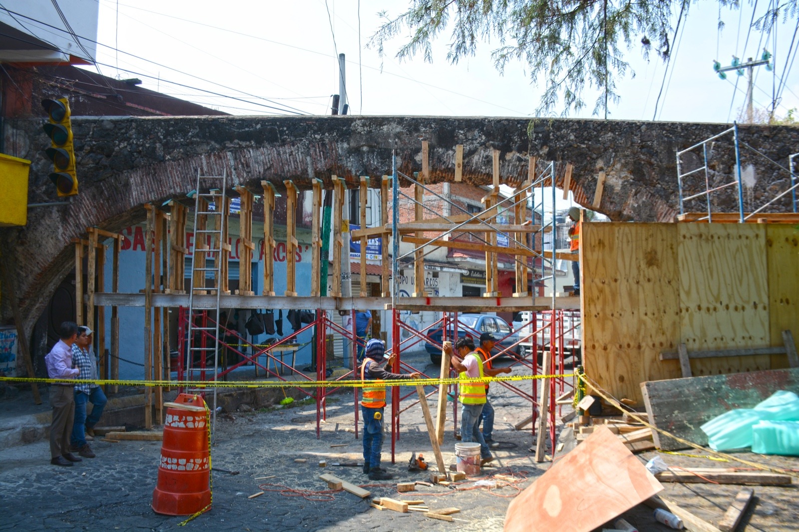 Uno de los principales objetivos de esta supervisión, fue informar a las y los vecinos por parte de titulares de la empresa encargada de la obra y certificada por el INAH, en qué consisten los trabajos en el arco del acueducto que está siendo intervenido sobre calle Carlos Cuaglia en el barrio de Gualupita, misma que se encuentra cerrada al paso vehicular y peatonal por el apuntalamiento y la consolidación de la estructura que data del Siglo XVIII.