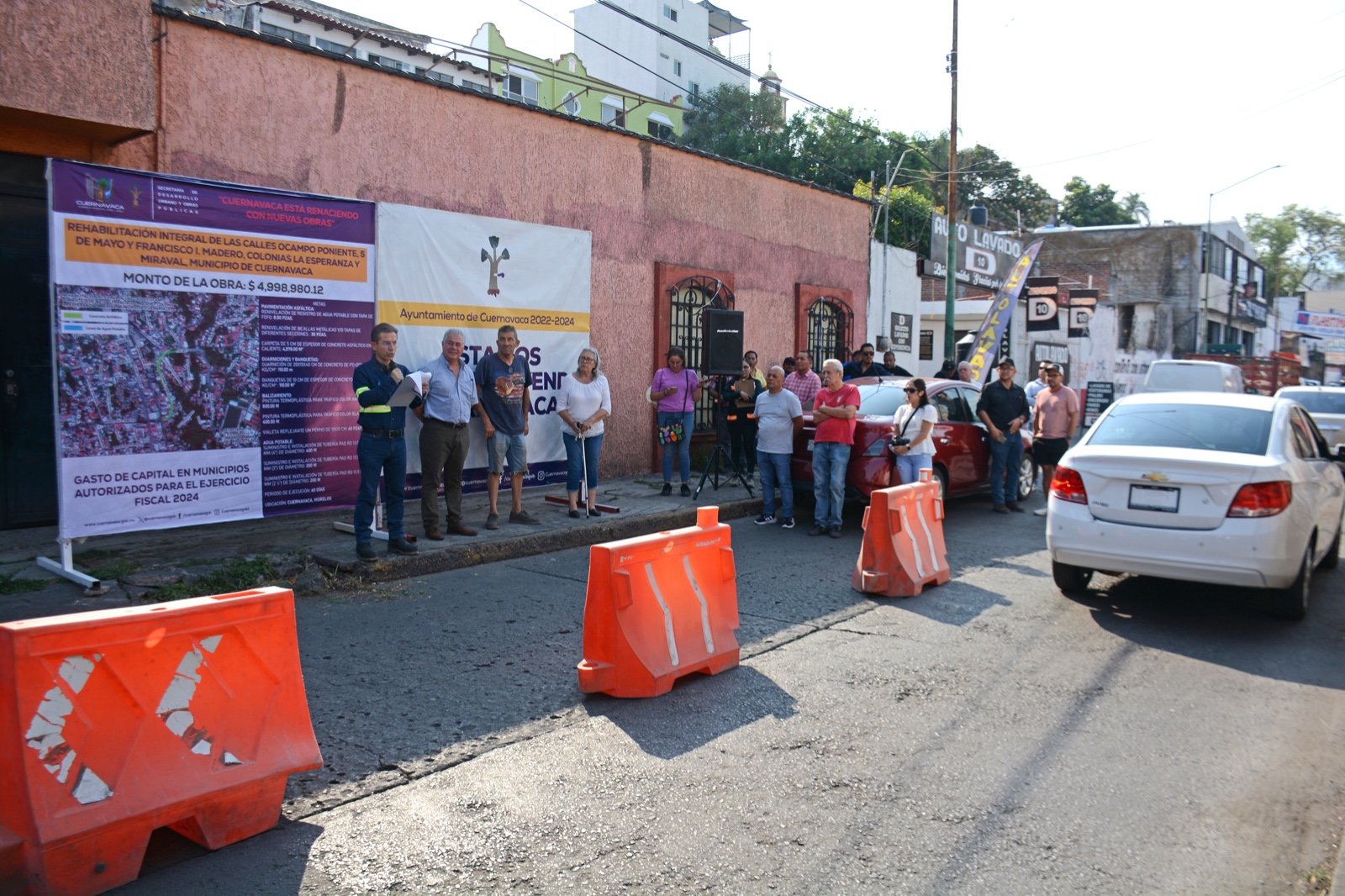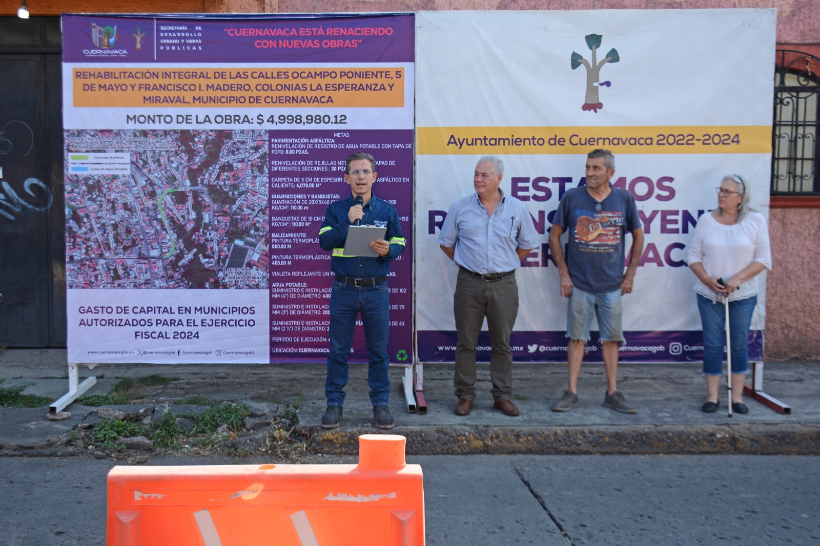 Con una inversión de cuatro millones 998 mil 980.12 pesos de recursos de gastos de capital en municipios 2024, el Ayuntamiento de Cuernavaca arrancó los trabajos de rehabilitación integral de las calles Ocampo Poniente, 5 de mayo y Francisco I. Madero de las colonias La Esperanza y Miraval que consta de la renovación de líneas de agua potable que mejorarán la calidad del servicio en el suministro del vital líquido.