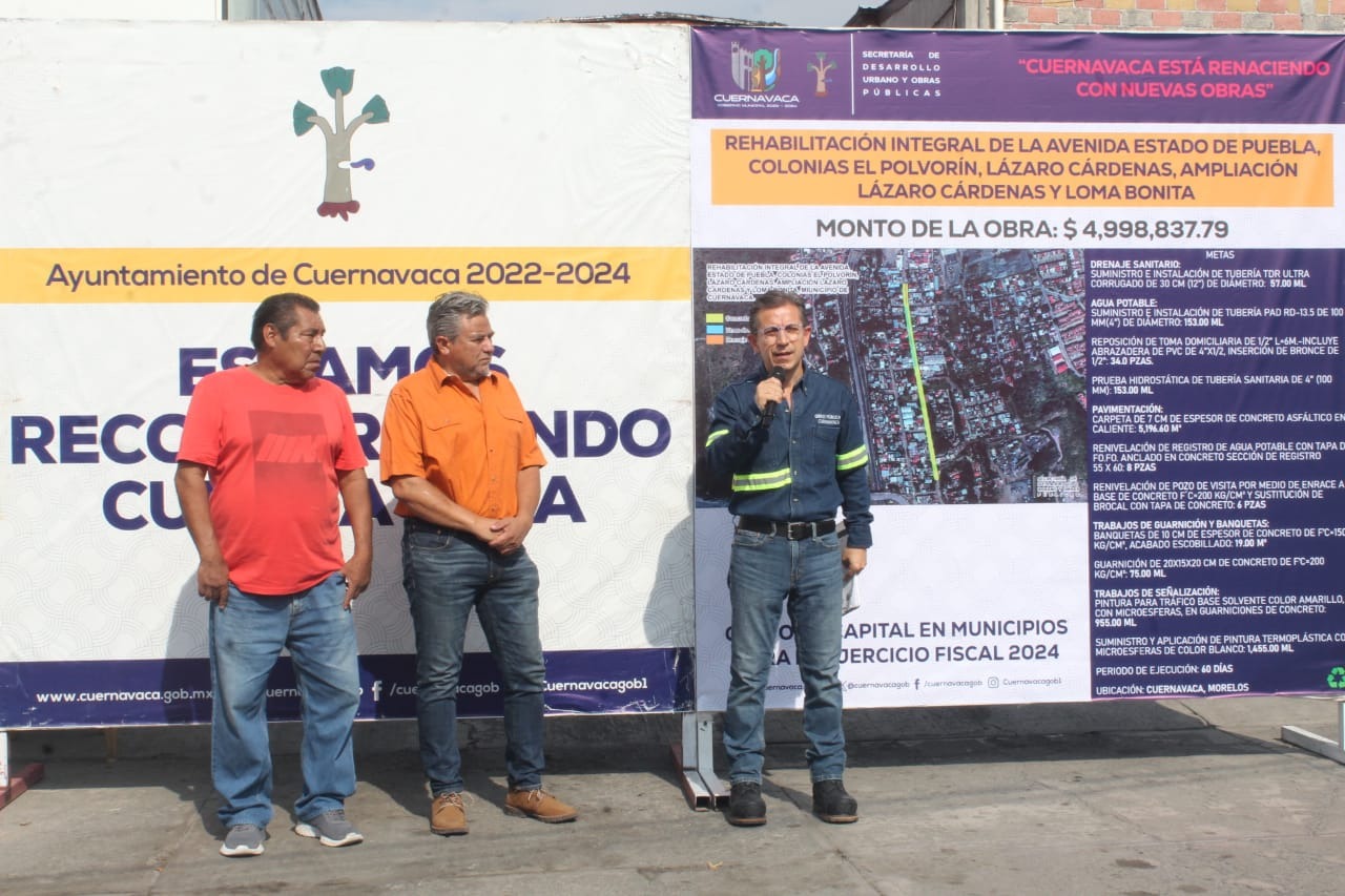 El Ayuntamiento de Cuernavaca sigue apostando a tener mejores calles y con mejores servicios, lo cual quedó refrendado este martes con la entrega de la construcción de pavimento con concreto asfáltico y la rehabilitación de la red de drenaje sanitario y de la línea de agua potable de la avenida Estado de Puebla que beneficiará a más de 22 mil 800 habitantes directos de las colonias El Polvorín, Lázaro Cárdenas, Ampliación Lázaro Cárdenas y Loma Bonita.