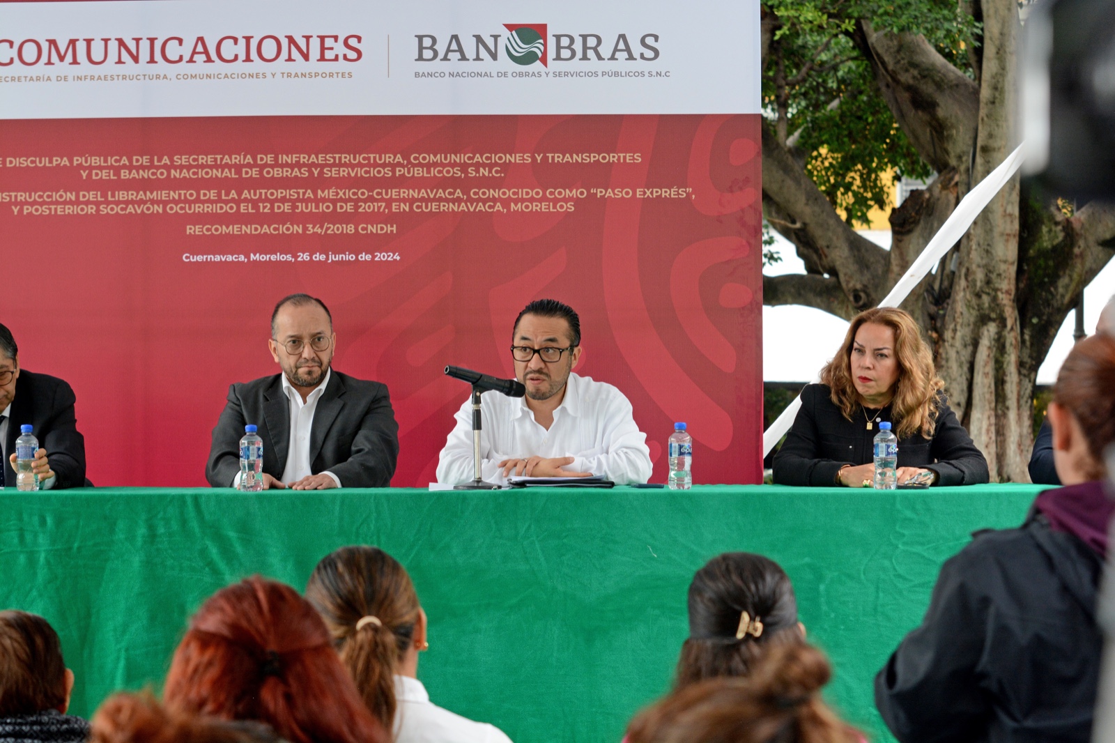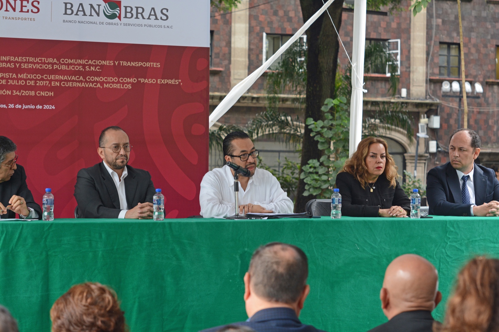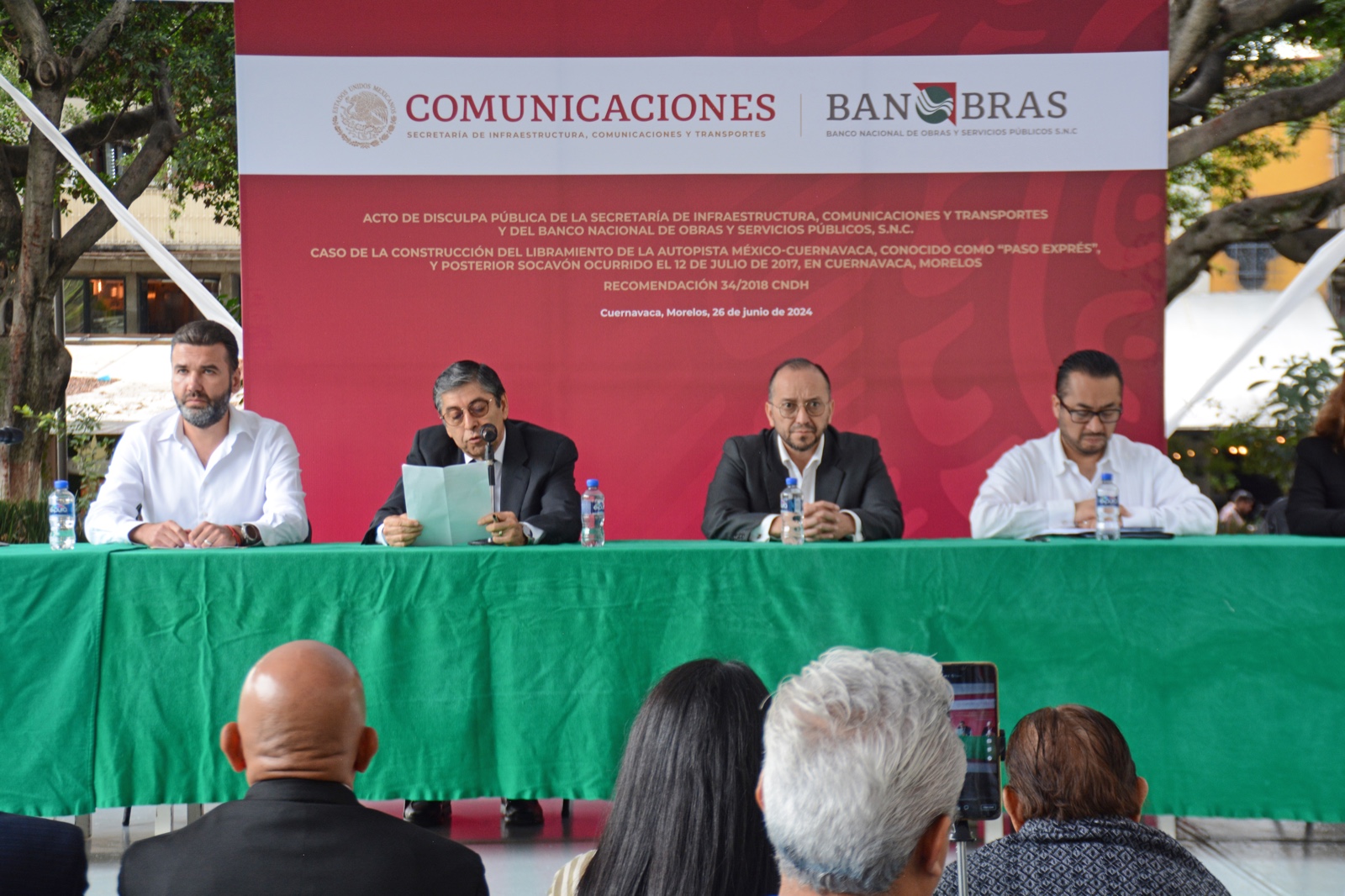 Las disculpas públicas fueron ofrecidas por el director general del Centro SICT Morelos, Óscar Rigoberto Coello Rodríguez y por el director de Operación Técnica y Seguimiento del Banco Nacional de Obras y Servicios Públicos, S.N.C, Sergio Enrique Sánchez Rivera, así como por el titular de la Unidad de Seguimiento de Recomendaciones de la Comisión Nacional de Derechos Humanos, César Eduardo Medel García, quien explicó el contenido de la recomendación 34/2018.
