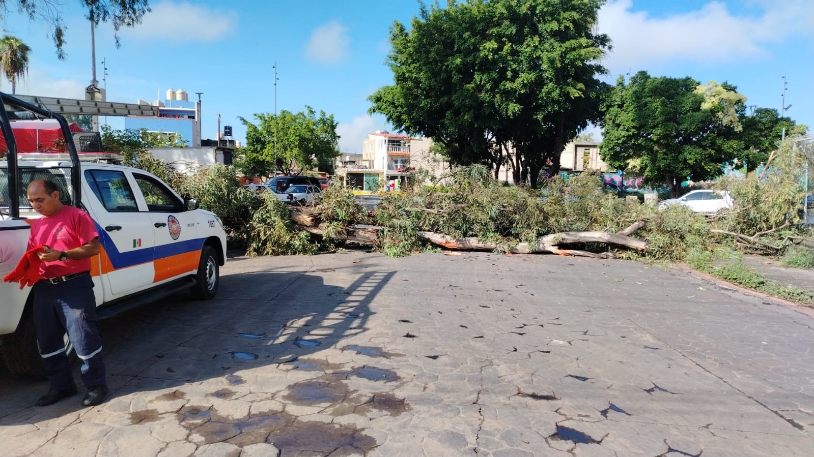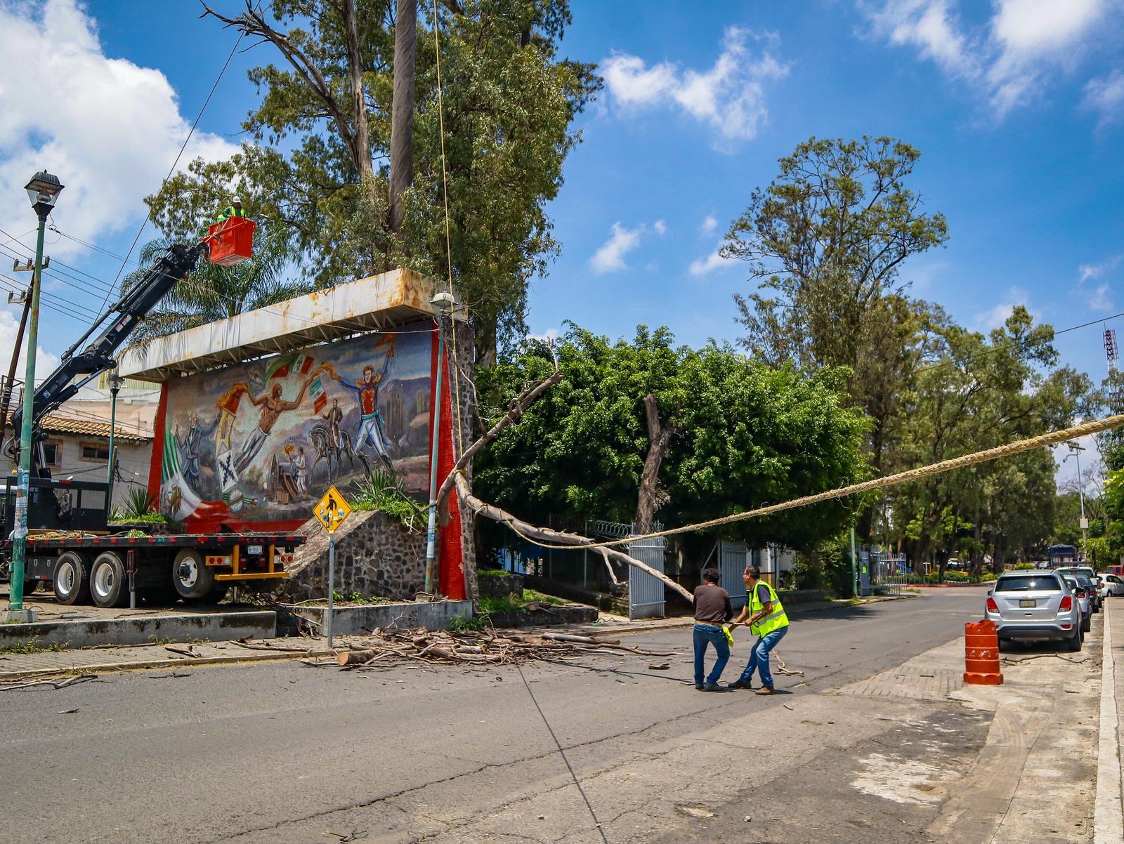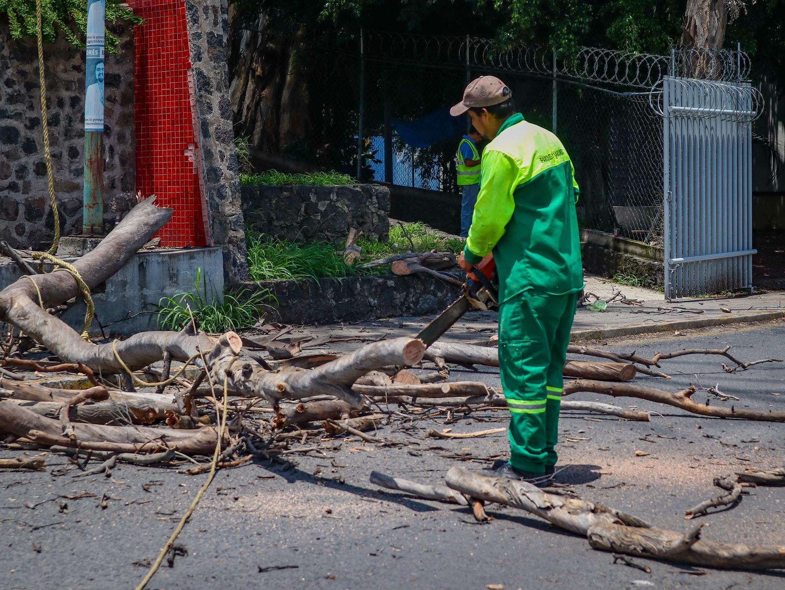 En un trabajo coordinado con Bomberos, Rescate y Urgencias Médicas de Cuernavaca, en una acción inmediata para atender diversos reportes, como parte del Programa de Mantenimiento de Áreas Verdes y Camellones, el Ayuntamiento de Cuernavaca, a través de la Secretaría de Desarrollo Sustentable y Servicios Públicos con personal de la Dirección de Parques y Jardines, se efectuaron trabajos de poda mayor y retiro de un árbol y ramas colapsadas por la lluvia y fuertes vientos en la zona arbolada de Los Patios de la Estación