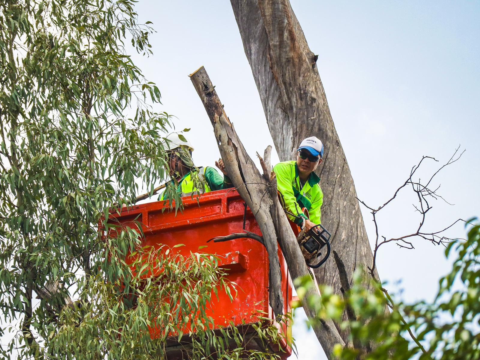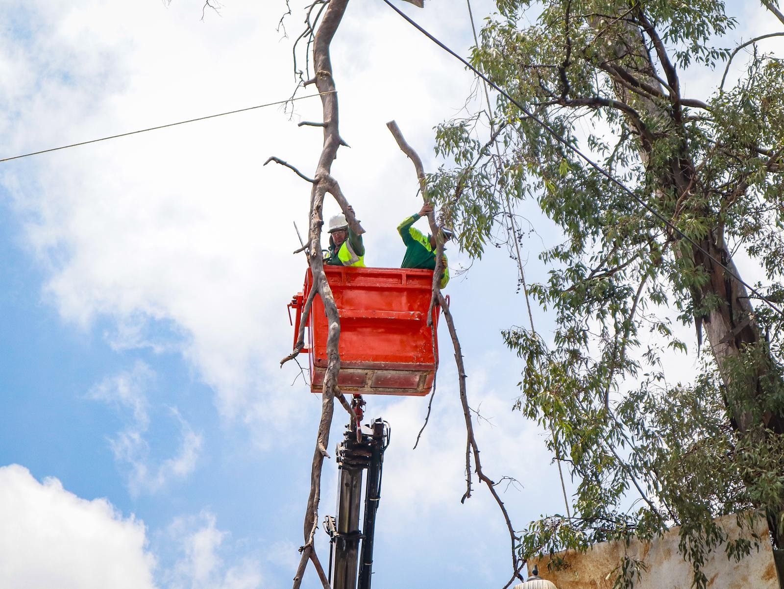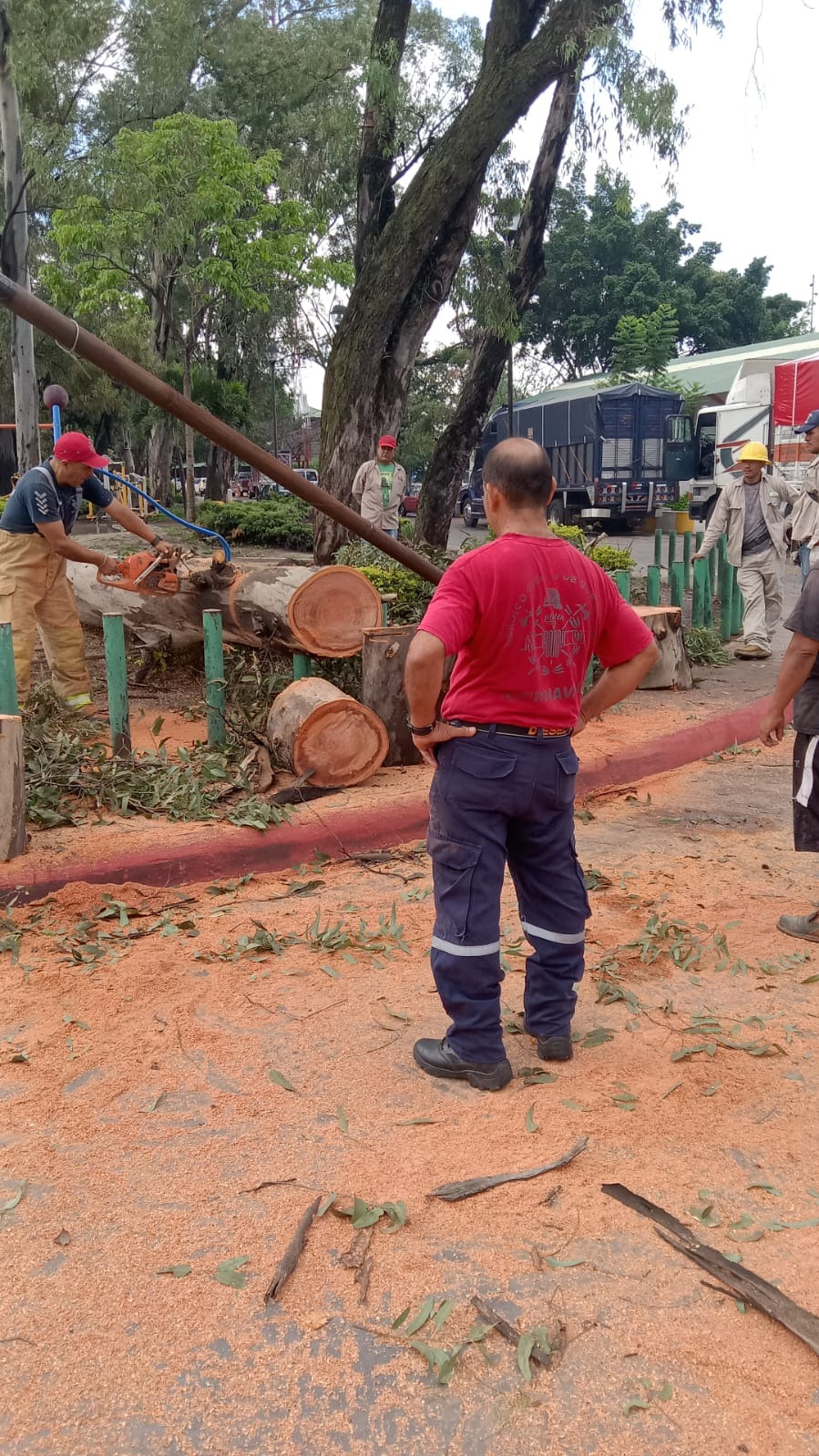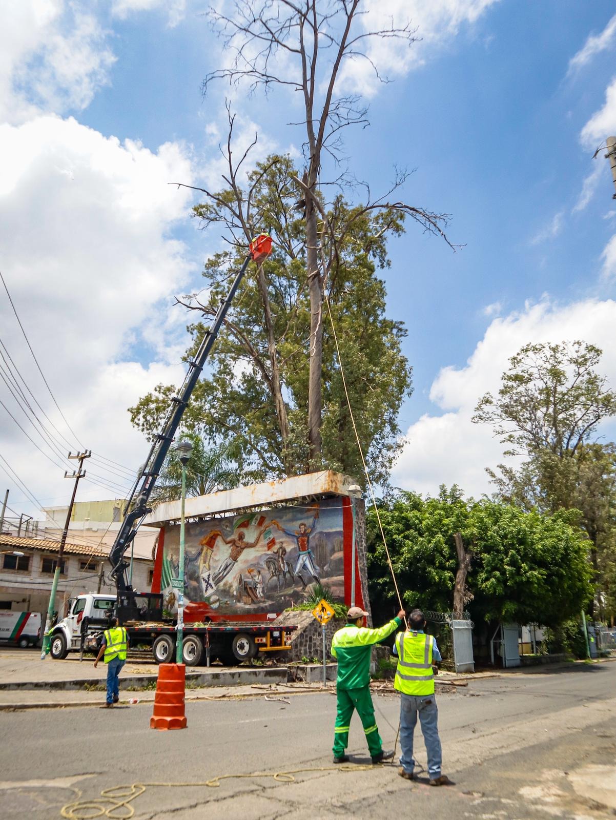 En este trabajo realizado las primeras horas de este jueves, se procedió a realizar el troceo de dos árboles secos de tipo eucalipto, de aproximadamente 30mts de altura en riesgo de colapsar sobre Leandro Valle Oriente, esquina con Río Balsas, donde se encuentra el parque lineal de la colonia Estación.