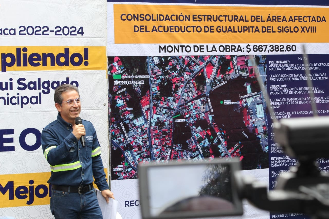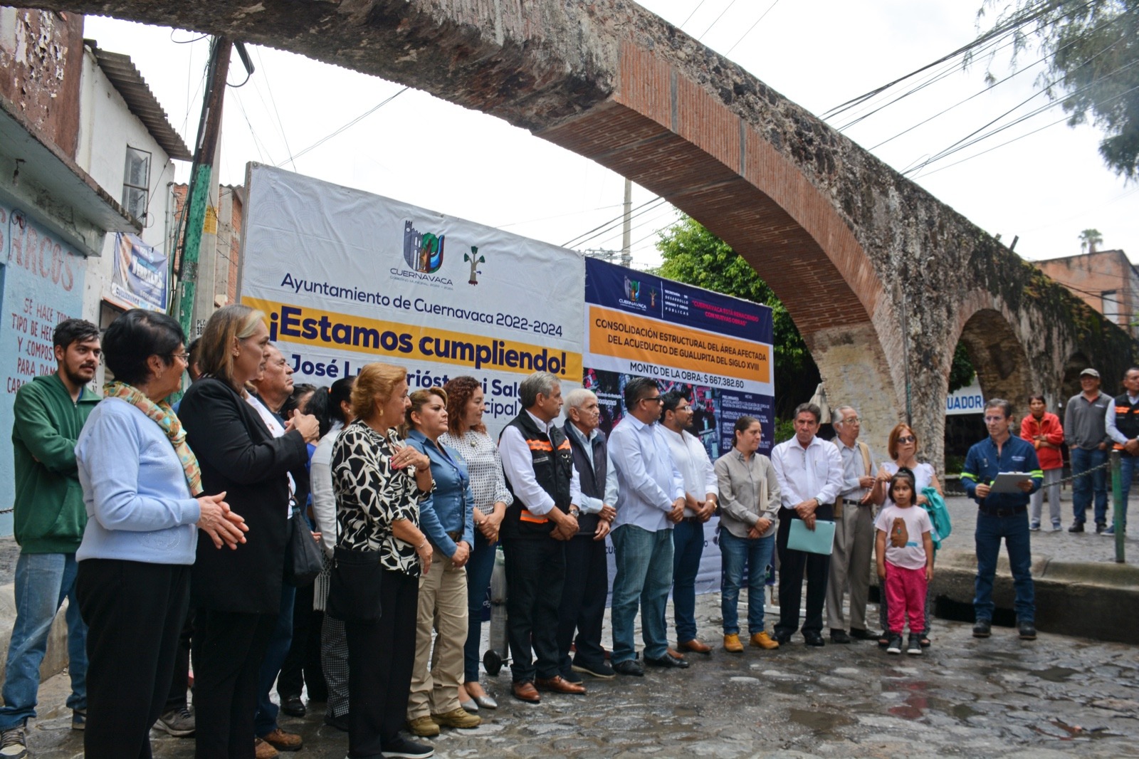 Con la finalidad de preservar su riqueza arquitectónica y el símbolo que representa a nivel nacional, el presidente municipal de Cuernavaca, José Luis Urióstegui Salgado, encabezó este jueves la inauguración de la obra de restauración y consolidación estructural del área afectada del acueducto del barrio de Gualupita que sufrió deterioro por el tiempo y recientemente ante el golpe de dos vehículos, mismo que fue intervenido en coordinación con especialistas del Instituto Nacional de Antropología e Historia (INAH).