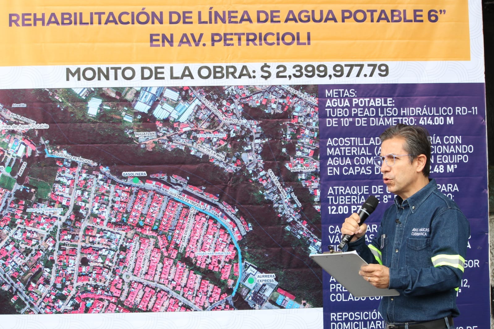 El presidente municipal de Cuernavaca, José Luis Urióstegui Salgado, da continuidad al programa de rehabilitación de tubería de agua potable en la avenida Gustavo Petriccioli en la colonia Lomas de Ahuatlán, donde con un monto de inversión de dos millones 399 mil 977.79 pesos del fondo de recursos propios, se modernizarán de 414 metros de línea de agua, lo que optimizará los servicios en esta zona de la ciudad, destinado en suma más de 20 millones de pesos para mejorar la calidad de vida de sus habitantes.