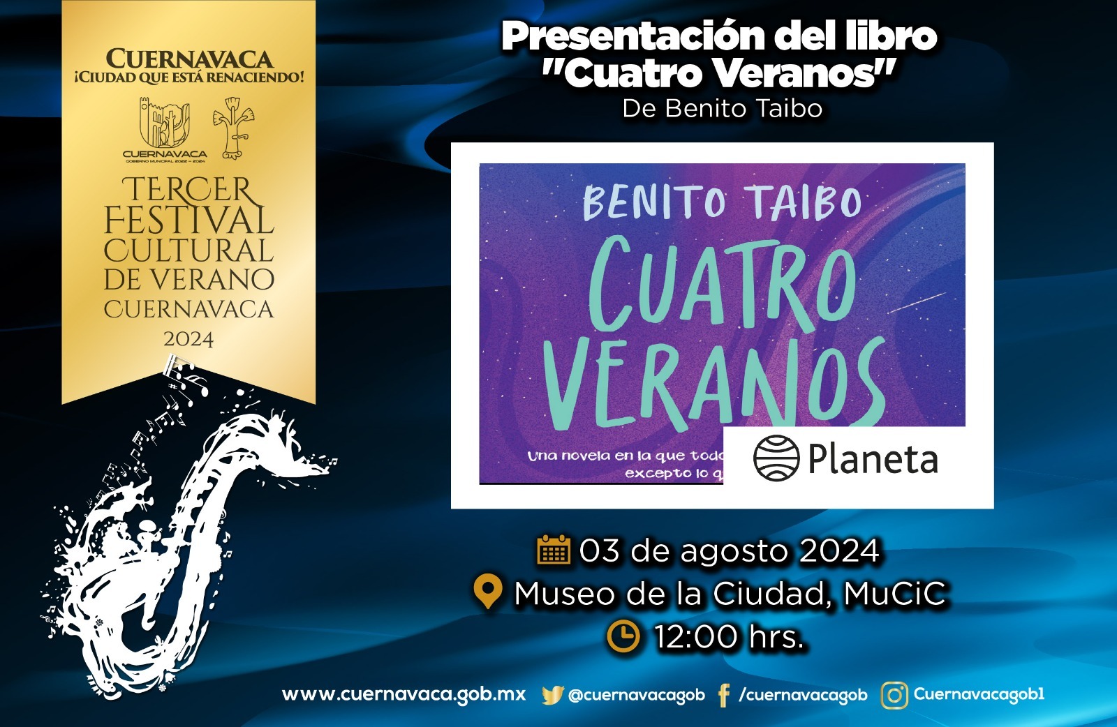 Para este sábado 3 de agosto, a las 12:00 horas en el Museo de la Ciudad de Cuernavaca, se llevará a cabo la presentación de la más reciente obra literaria de Benito Taibo, “Cuatro Veranos”, Una novela en la que todo lo que sucede es real, excepto lo que no es, con la presencia confirmada del escritor, periodista y promotor de la lectura entre los jóvenes.