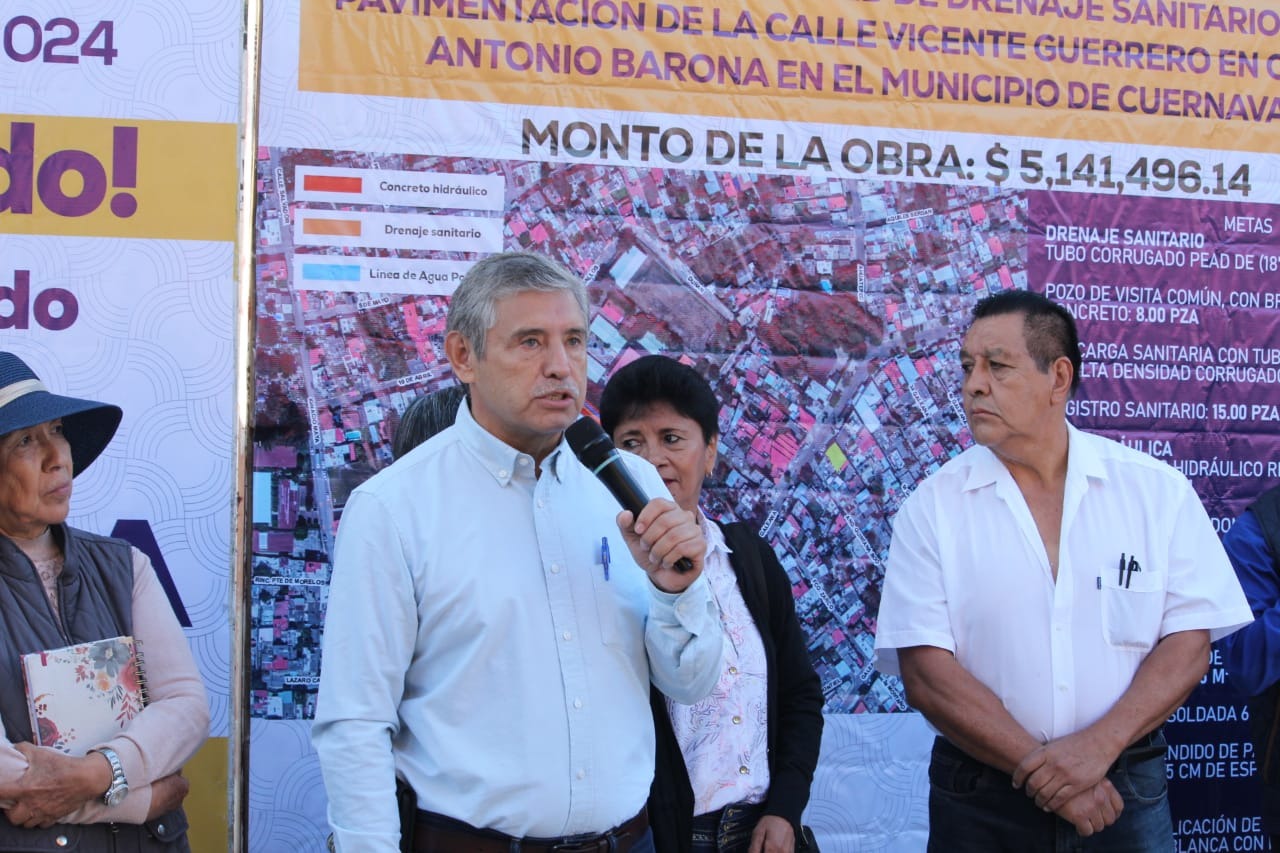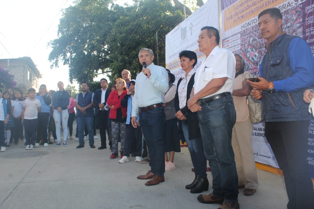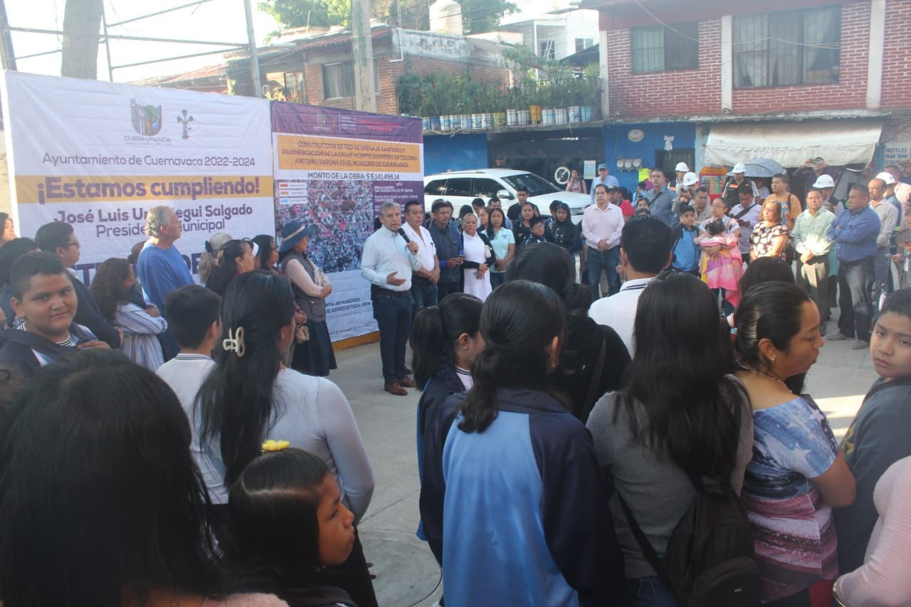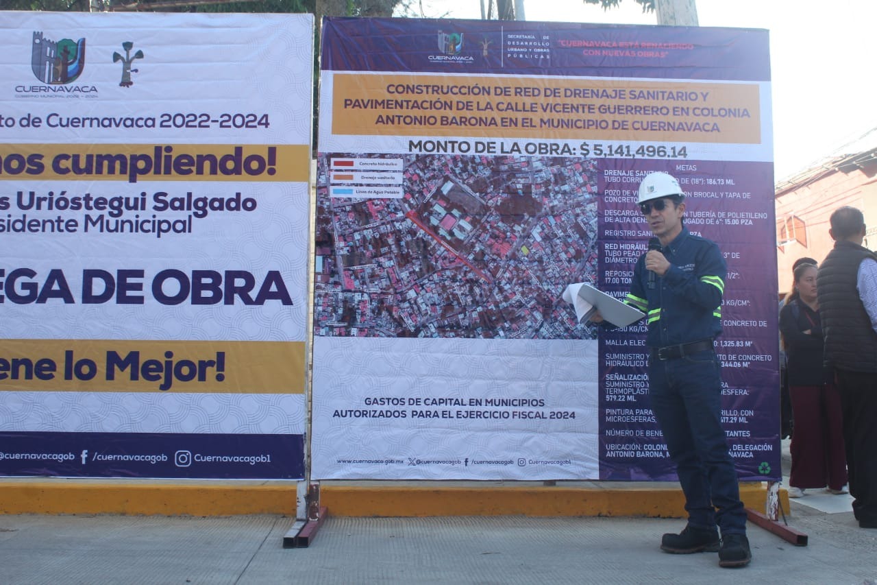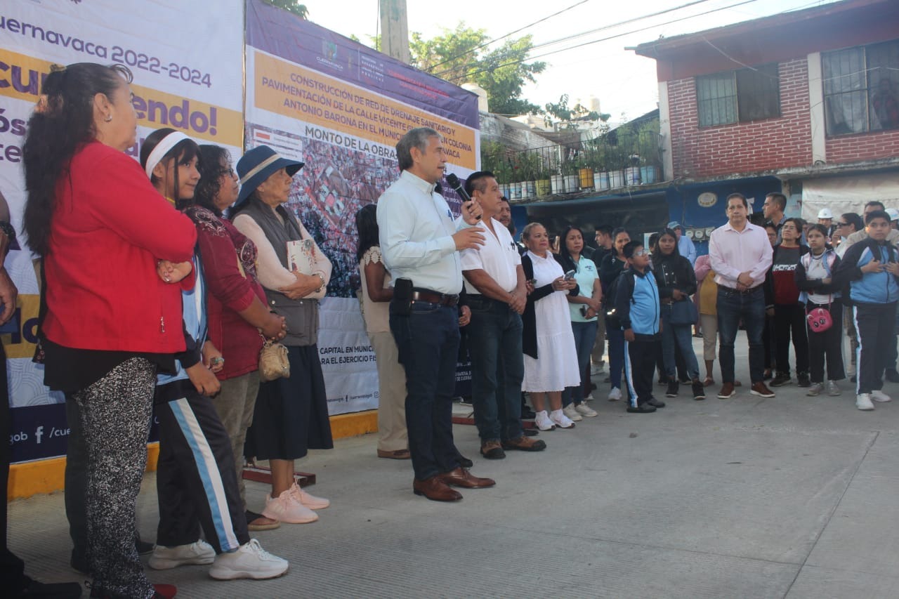 Como resultado del trabajo conjunto entre el Ayuntamiento de Cuernavaca y el Congreso del Estado de Morelos, el presidente municipal, José Luis Urióstegui Salgado, acompañado del diputado local, Ángel Adame Jiménez, inauguró este jueves la obra de rehabilitación integral de la calle Vicente Guerrero en la colonia Antonio Barona que con una inversión de cinco millones 141 mil 496.14 pesos del Fondo de Gastos de Capital en Municipios contempló el cambio del drenaje sanitario, de la línea de agua potable y la construcción del pavimento con concreto hidráulico.