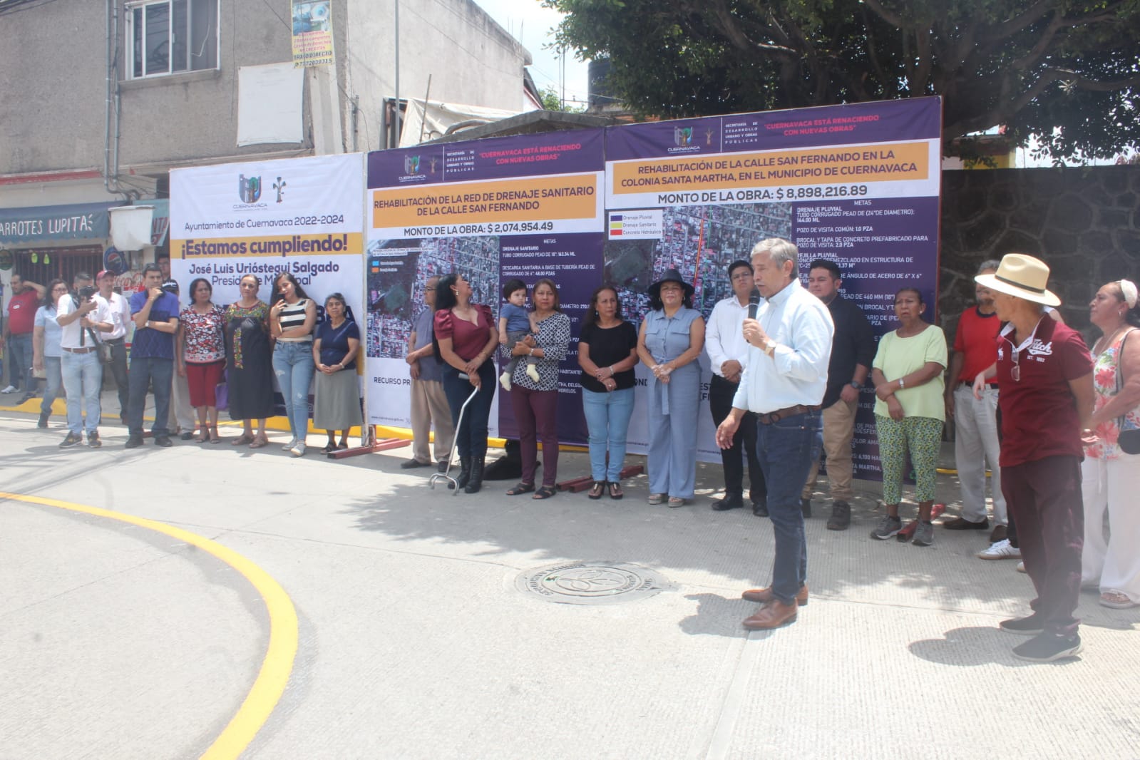 Para revertir un largo periodo sin inversión ni planificación, el presidente municipal de Cuernavaca, José Luis Urióstegui Salgado, inauguró dos obras de rehabilitación integral en la calle San Fernando de la colonia Santa Martha, para lo cual se destinaron 10 millones 974 mil 138.66 pesos de una mezcla de inversión del Fondo de Recursos Propios Municipales y del Fondo de Infraestructura Regional Municipal etiquetado por el Congreso de Morelos, a fin de evitar inundaciones y salvaguardar la integridad de la población, protegiendo sus bienes muebles e inmuebles.
