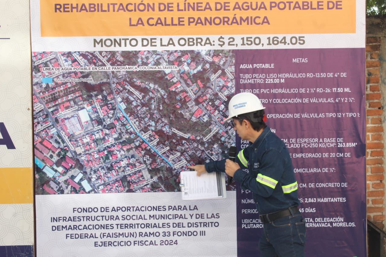 En un periodo estimado de 45 días naturales, el Ayuntamiento de Cuernavaca, a través de la Secretaría de Desarrollo Urbano y Obras Públicas en coordinación con el Sistema de Agua Potable y Alcantarillado de Cuernavaca (SAPAC), estará rehabilitando la línea de agua potable de la calle Panorámica en la colonia Altavista, con el objetivo de mejorar el servicio de distribución de agua para dos mil 863 personas.