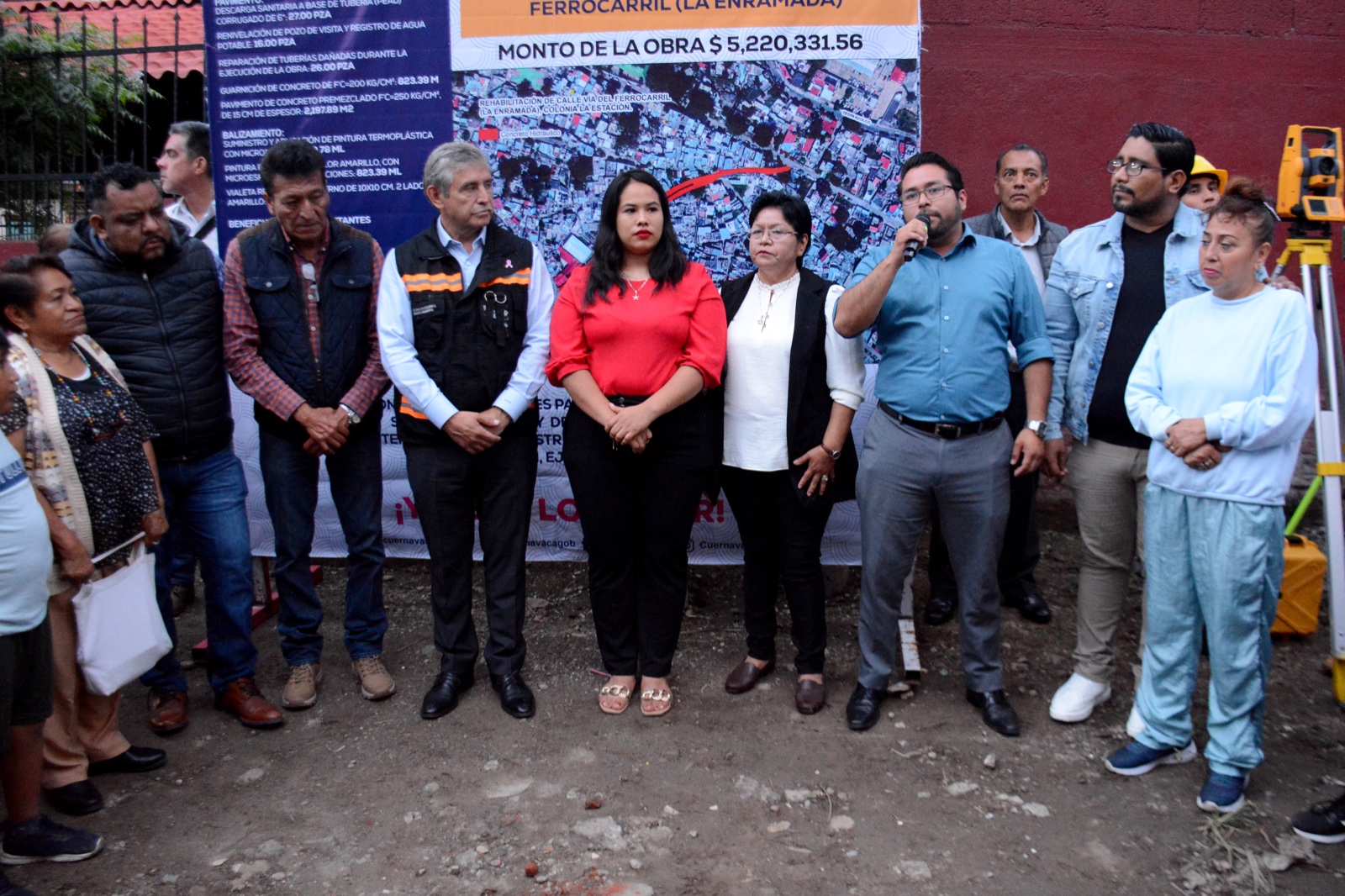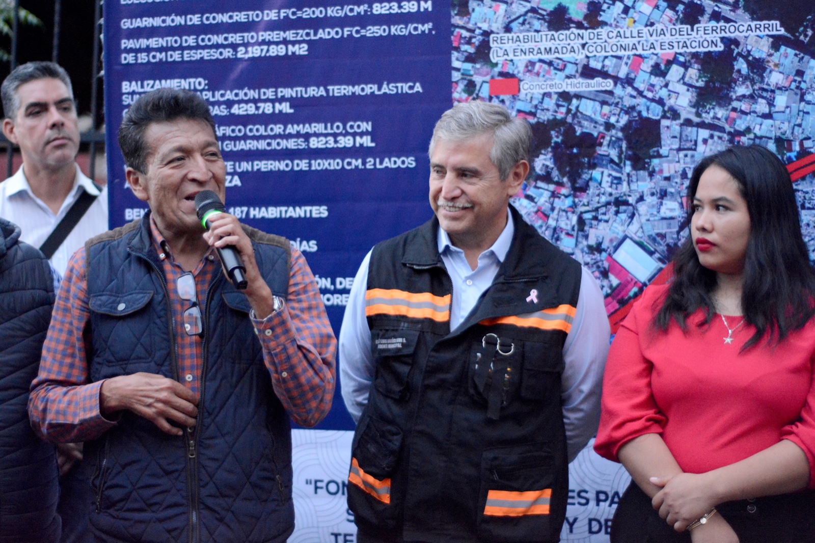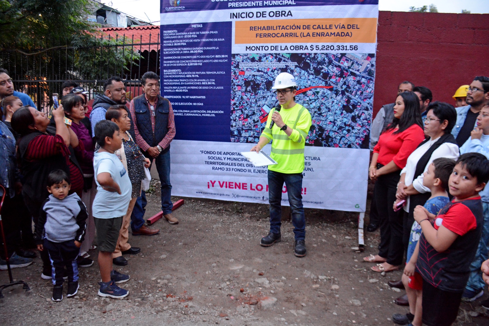 El presidente municipal de Cuernavaca, José Luis Urióstegui Salgado, puso en marcha la obra integral de pavimentación con concreto hidráulico de la calle Vía del Ferrocarril (La Enramada) en la colonia Patios de la Estación que con una inversión de cinco millones 220 mil 331.56 pesos del Fondo de Aportaciones para la Infraestructura Social Municipal (FAISMUN) busca mejorar la calidad de vida de más de 16 mil personas, al transformar en su totalidad esta vía de comunicación que era intransitable por la falta completa de la cinta asfáltica.