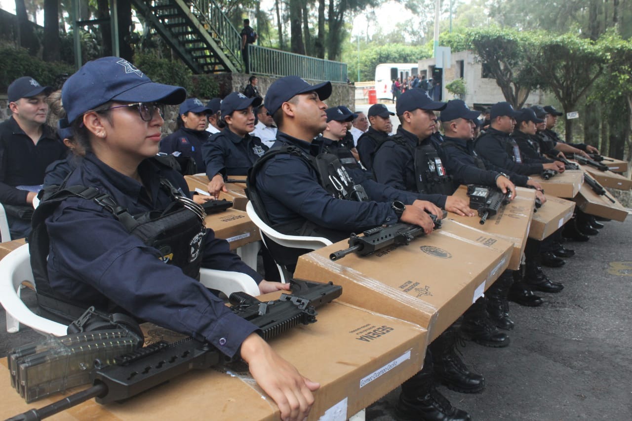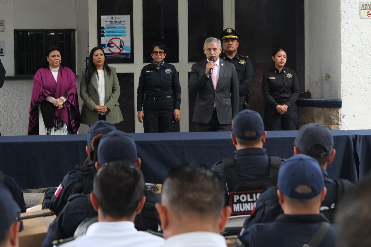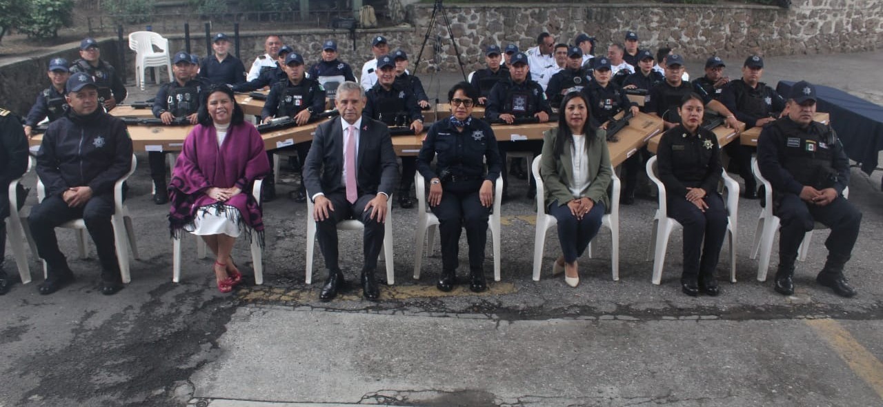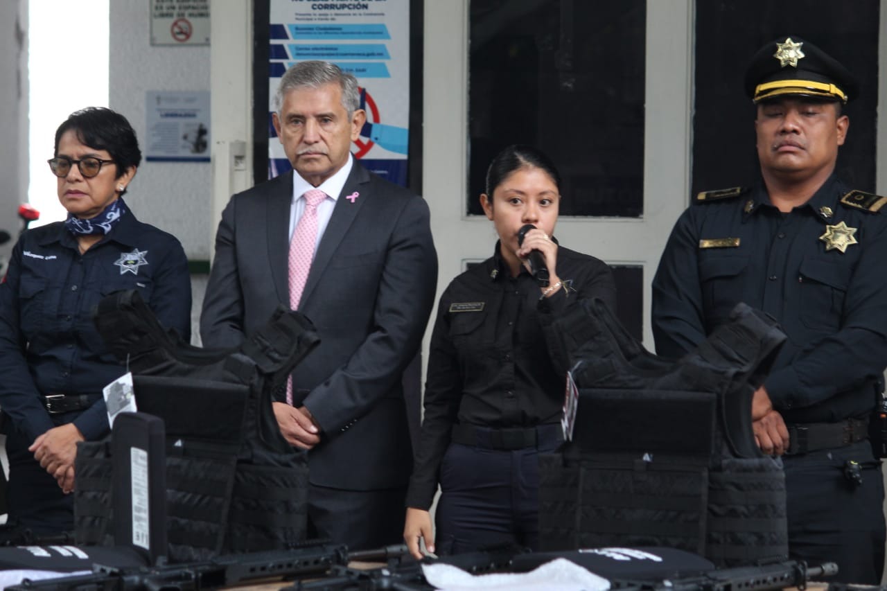 En seguimiento a la dignificación policial impulsada por el Ayuntamiento de Cuernavaca para fortalecer la seguridad pública y consolidar la paz, el presidente municipal, José Luis Urióstegui Salgado, encabezó este martes la entrega de 130 equipos tácticos de protección a la Policía Preventiva y Vial de la Secretaría de Protección y Auxilio Ciudadano (SEPRAC), así como 15 armas largas, material adquirido con el FORTAMUN y recursos propios, beneficiando también a elementos de nuevo ingreso que se suman a las acciones de prevención y combate al delito.