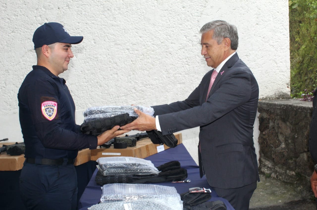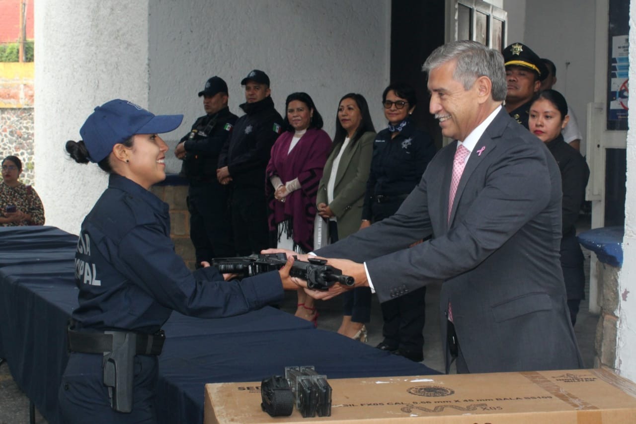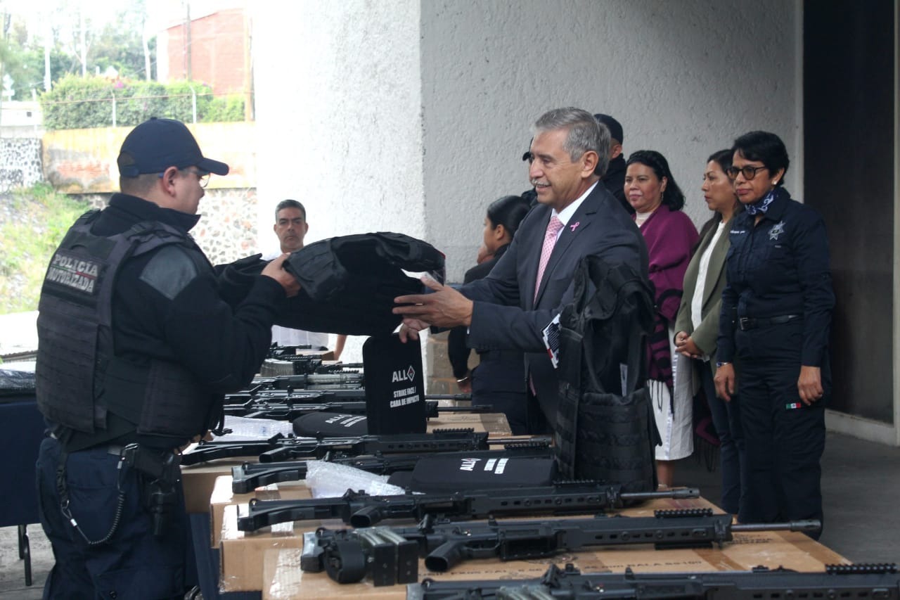 En seguimiento a la dignificación policial impulsada por el Ayuntamiento de Cuernavaca para fortalecer la seguridad pública y consolidar la paz, el presidente municipal, José Luis Urióstegui Salgado, encabezó este martes la entrega de 130 equipos tácticos de protección a la Policía Preventiva y Vial de la Secretaría de Protección y Auxilio Ciudadano (SEPRAC), así como 15 armas largas, material adquirido con el FORTAMUN y recursos propios, beneficiando también a elementos de nuevo ingreso que se suman a las acciones de prevención y combate al delito.