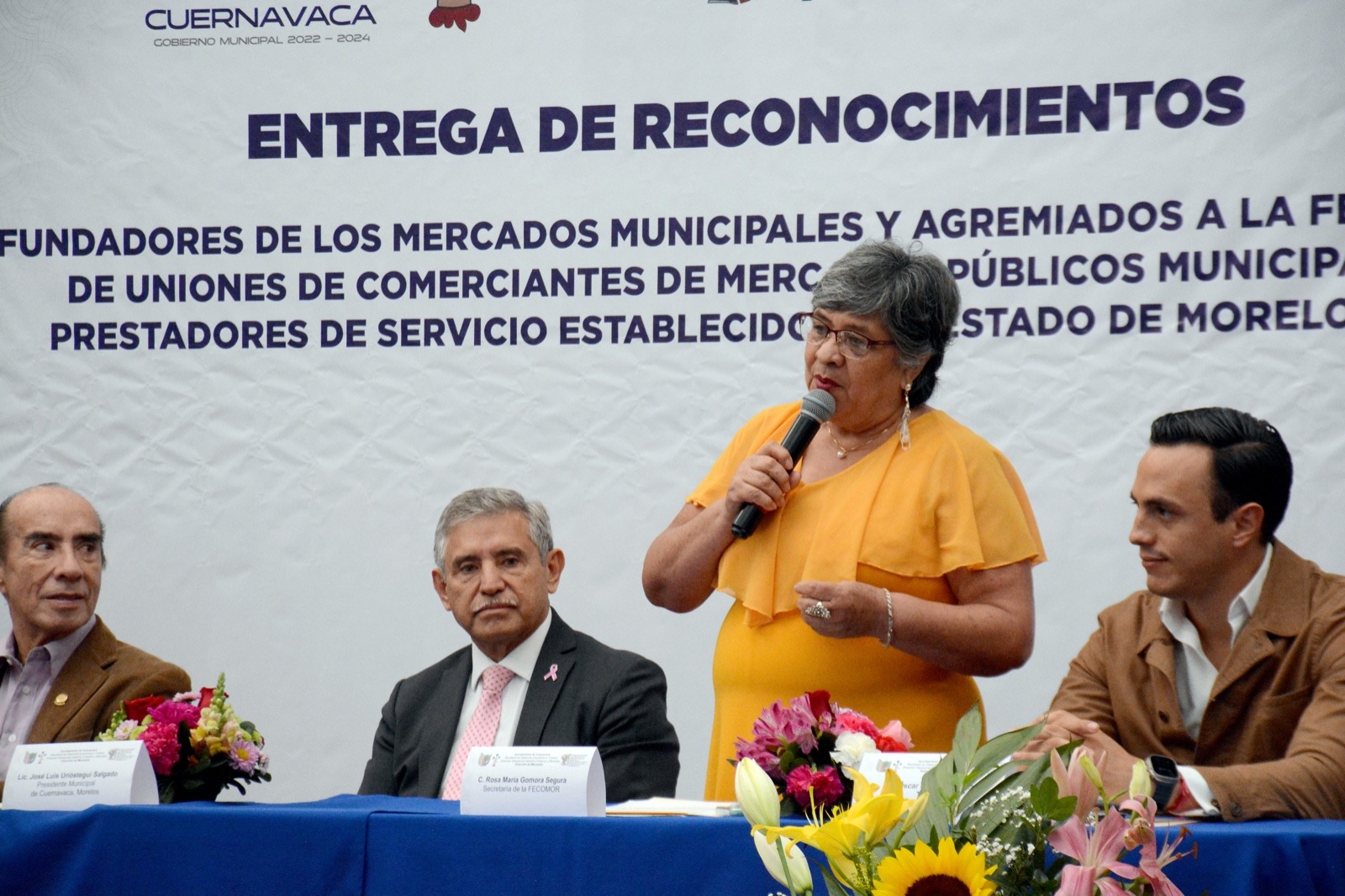 La secretaria general de la Federación de Uniones de Comerciantes de Mercados Públicos Municipales, Prestadores de Servicios Establecidos del Estado de Morelos A.C., Rosa María Gomora Segura, agradeció y reconoció el trabajo hecho por mujeres y hombres que por años han dedicado su vida al servicio y a la consolidación de los mercados de Cuernavaca, luchando de forma honorable por defender su patrimonio y la fuente de trabajo de cientos de familias, como es el caso Marcelino Vertiz Zúñiga, fundador de la federación.