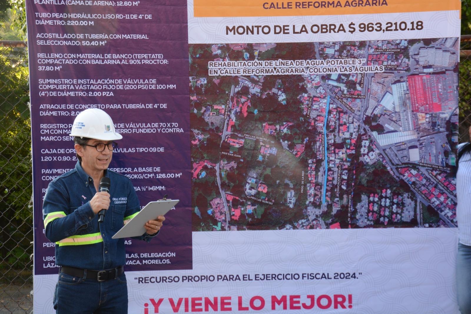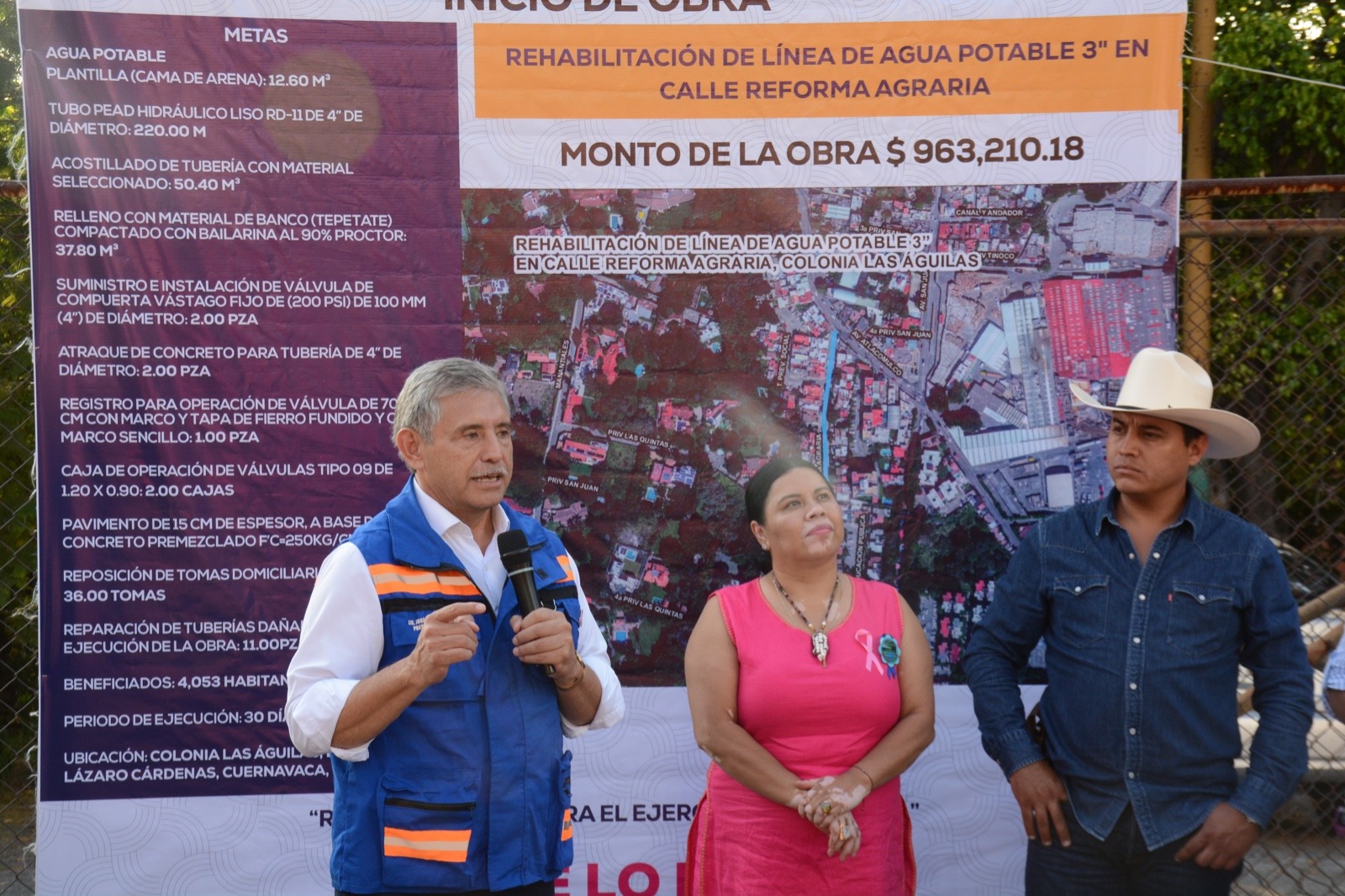 El presidente municipal de Cuernavaca, José Luis Urióstegui Salgado, dio el banderazo de arranque a la obra de rehabilitación de la línea de agua potable de tres pulgadas en calle Reforma Agraria de la colonia Las Águilas, la cual con un monto de inversión de 963 mil 210.18 pesos de recursos propios municipales mejorará la calidad de vida de cuatro mil 053 habitantes directos al garantizar su derecho al agua.