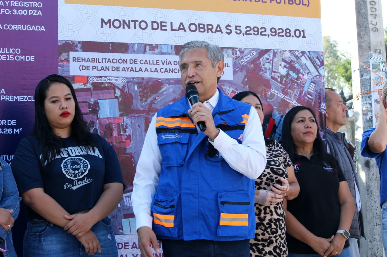De manera previa, el secretario de Desarrollo Urbano y Obras Públicas, Demetrio Chavira de la Torre, explicó que la obra que parte de la intersección con la avenida Plan de Ayala a la cancha de fútbol consistió en la construcción de dos mil 033.22 metros cuadrados de pavimento de concreto hidráulico premezclado con una resistencia de 250 kg/cm2, banquetas de 10 centímetros de espesor de concreto en 96.26 metros cuadrados y una rampa para personas con discapacidad de concreto premezclado en dos metros cuadrados.