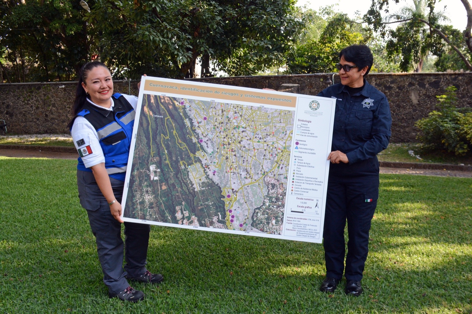 En el marco de la sesión del Consejo Estatal de Protección Civil, la titular de la SEPRAC acompañada de la coordinadora municipal de Protección Civil, Nora Isabel González Cruz, recibió un mapa físico con la muestra de riesgos que tiene Cuernavaca, en una primera etapa de origen natural, hidrometeorológicos y geológicos, a fin de otorgarles una herramienta que sea útil a que el próximo año no tengan tantos auxilios que atender, al ubicar que zonas deben ser priorizadas de manera preventiva.
