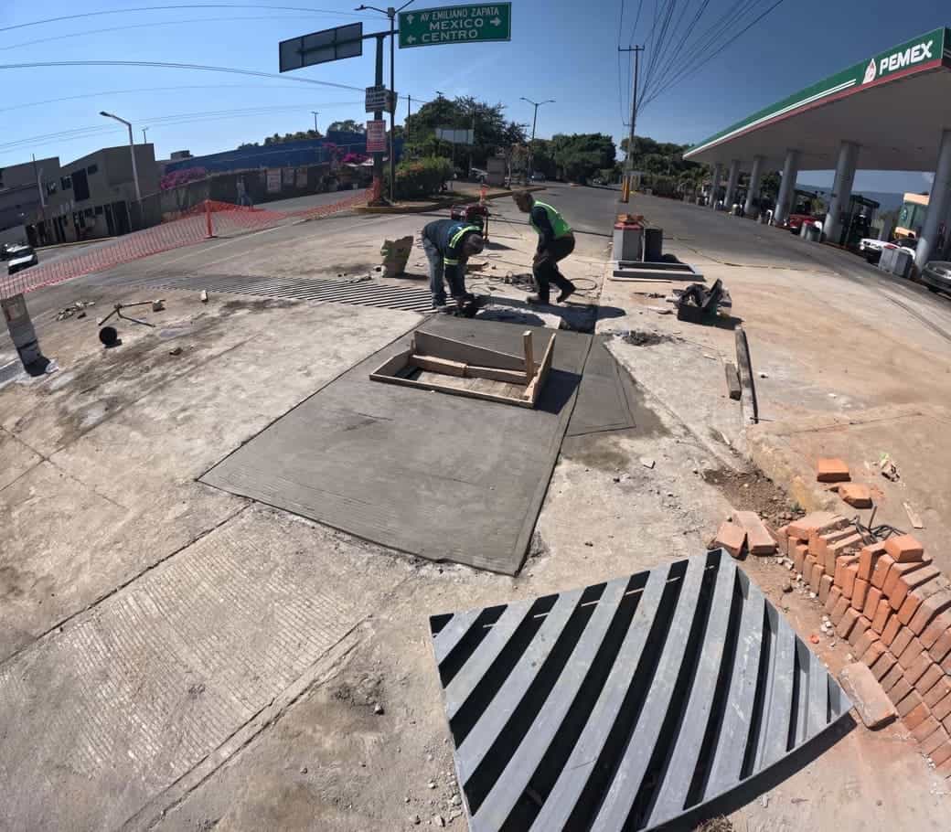 La rehabilitación de la línea de agua potable en la avenida Emiliano Zapata presenta un avance del 82 por ciento y la construcción de la red de drenaje pluvial y la rehabilitación de rejillas en la carretera federal México- Cuernavaca, un avance del 84 por ciento.