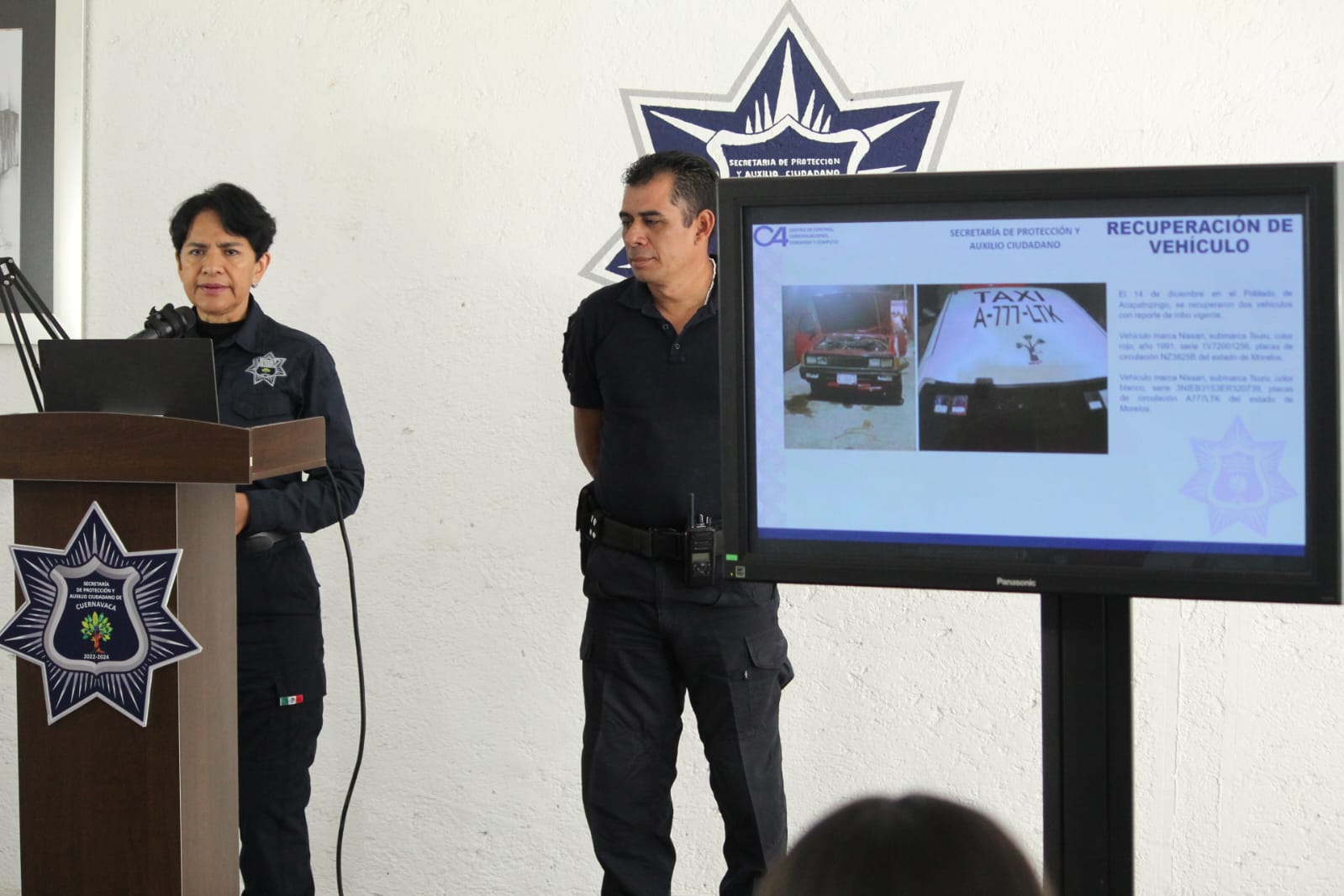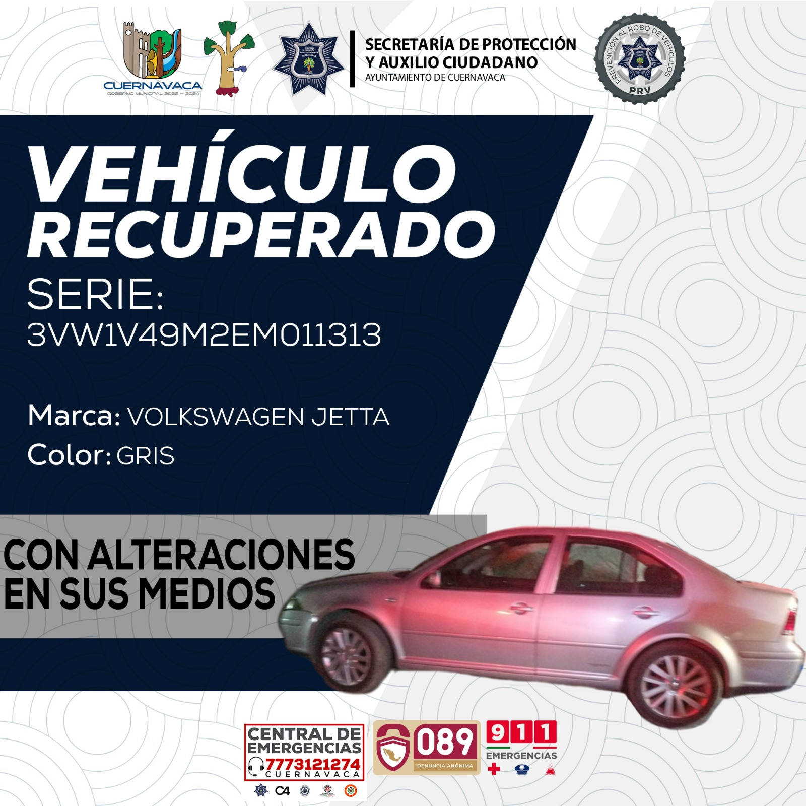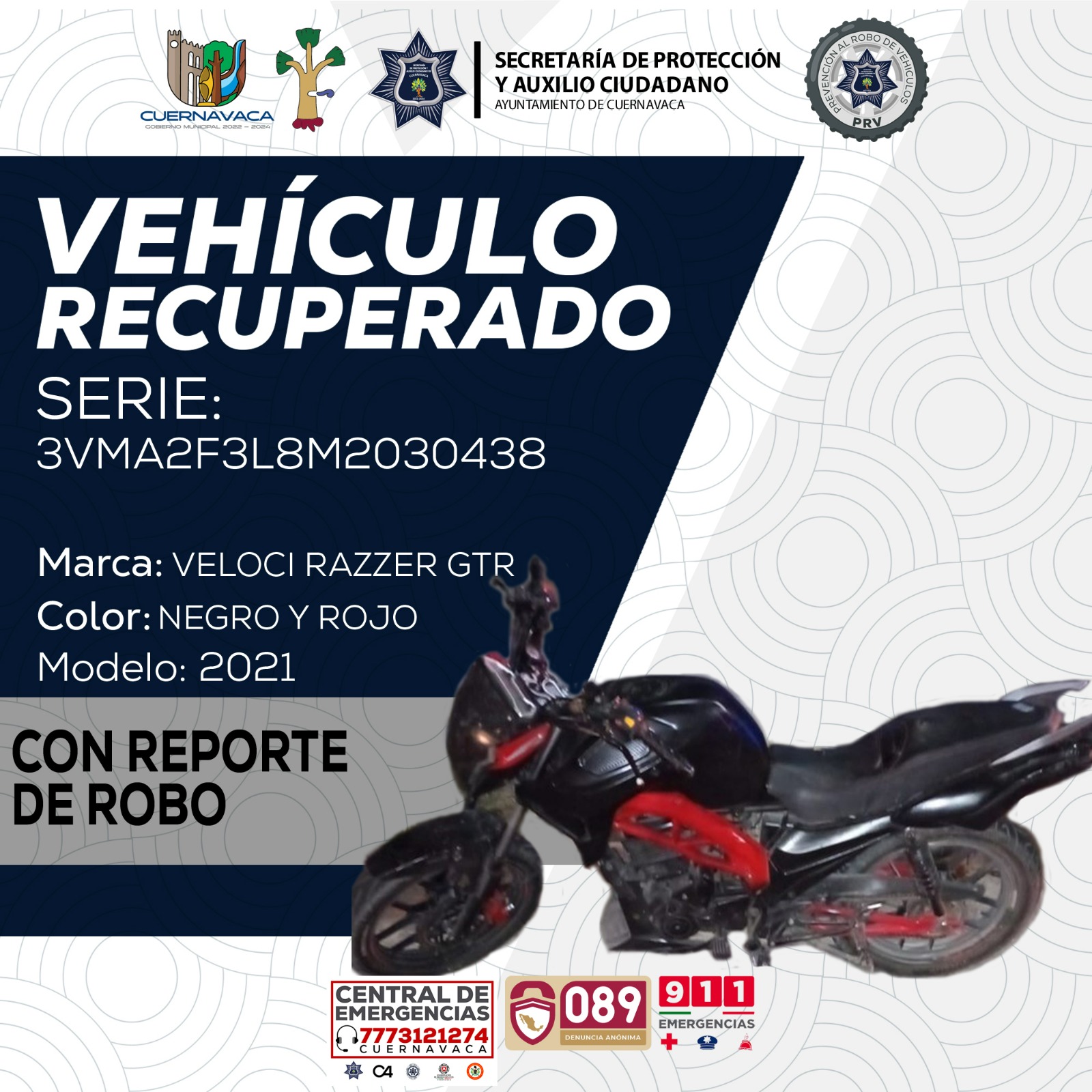 El 10 de diciembre en el poblado de Ahuatepec se recuperó un vehículo marca Volkswagen, submarca Jetta, color plata, número de serie 3VW1V49M2EM011313, con alteraciones en sus medios de identificación y el 11 de diciembre en la colonia La Unión se recuperó una motocicleta marca Veloci, tipo Razzer GTR, color rojo con negro, año 2021, número de serie 3VMA2F3L8M2030438, con reporte de robo vigente.