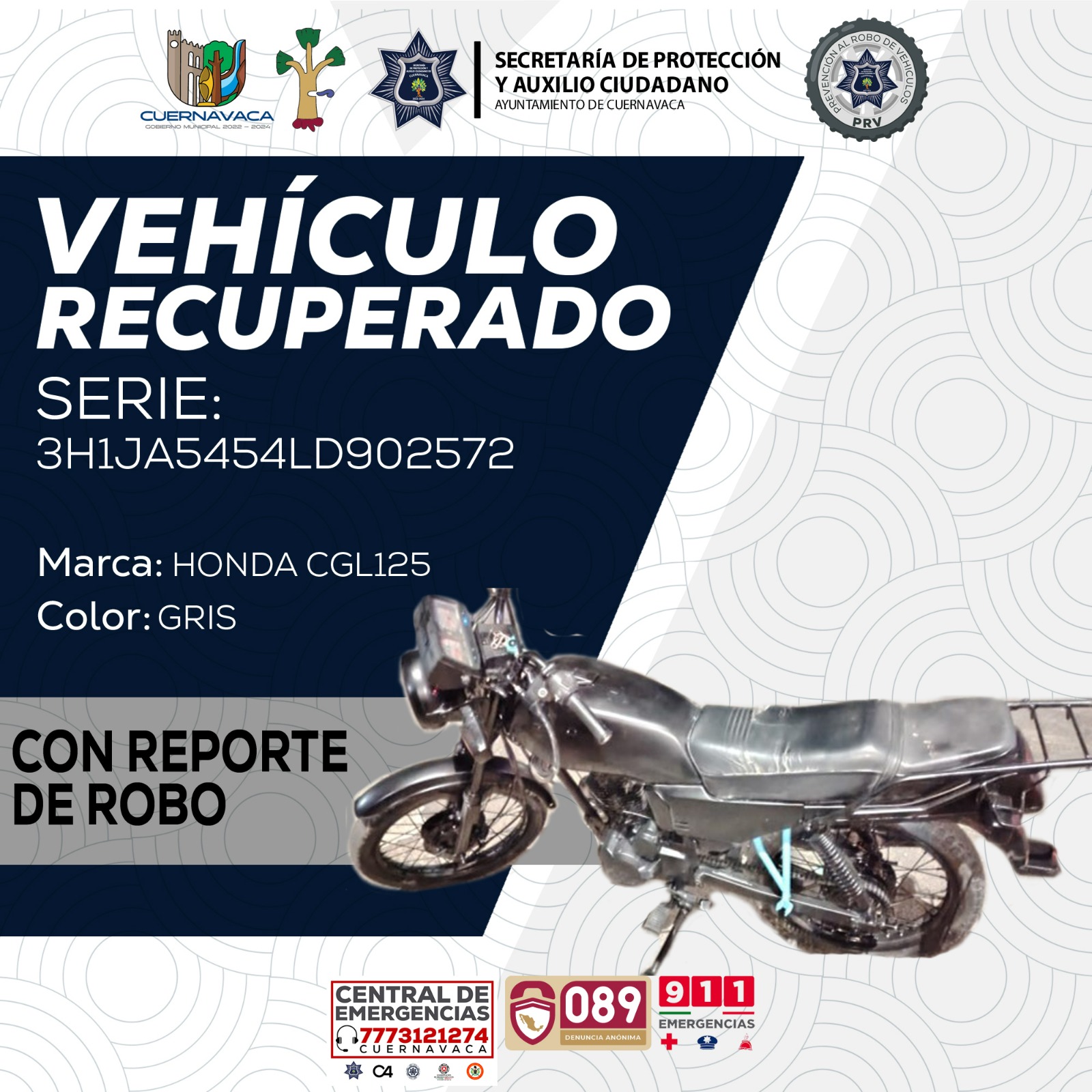 Derivado de la estrategia de seguridad implementada en la ciudad, el 10 de diciembre en la colonia Lomas de Cortés se detuvo y puso a disposición del Ministerio Público a Fabián Alonso “N”, por poseer una motocicleta con reporte de robo vigente de fecha 09 de diciembre del 2024. La unidad es una motocicleta marca Honda, tipo CGL 125, color negro, número de serie 3H1JA5454LD902572.