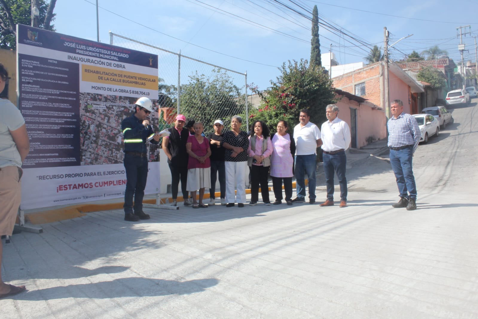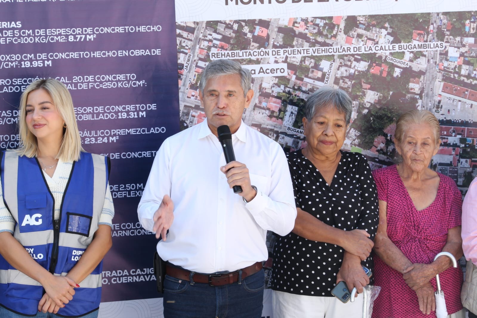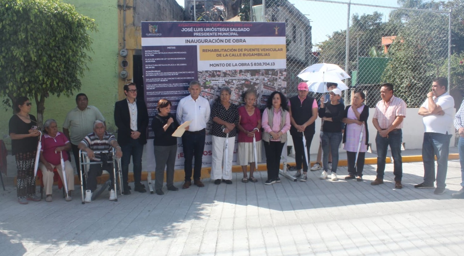 Tal y como lo había anunciado, el presidente municipal de Cuernavaca, José Luis Urióstegui Salgado, concluye la administración 2022- 2024 con la entrega de distintas obras públicas que abonan al progreso de la ciudad como fue el caso de la rehabilitación del puente vehicular de la calle Bugambilias en la colonia Satélite, que con una inversión de 838 mil 704.13 pesos de recursos propios municipales, mejorará las condiciones de tránsito y accesibilidad en la zona.
