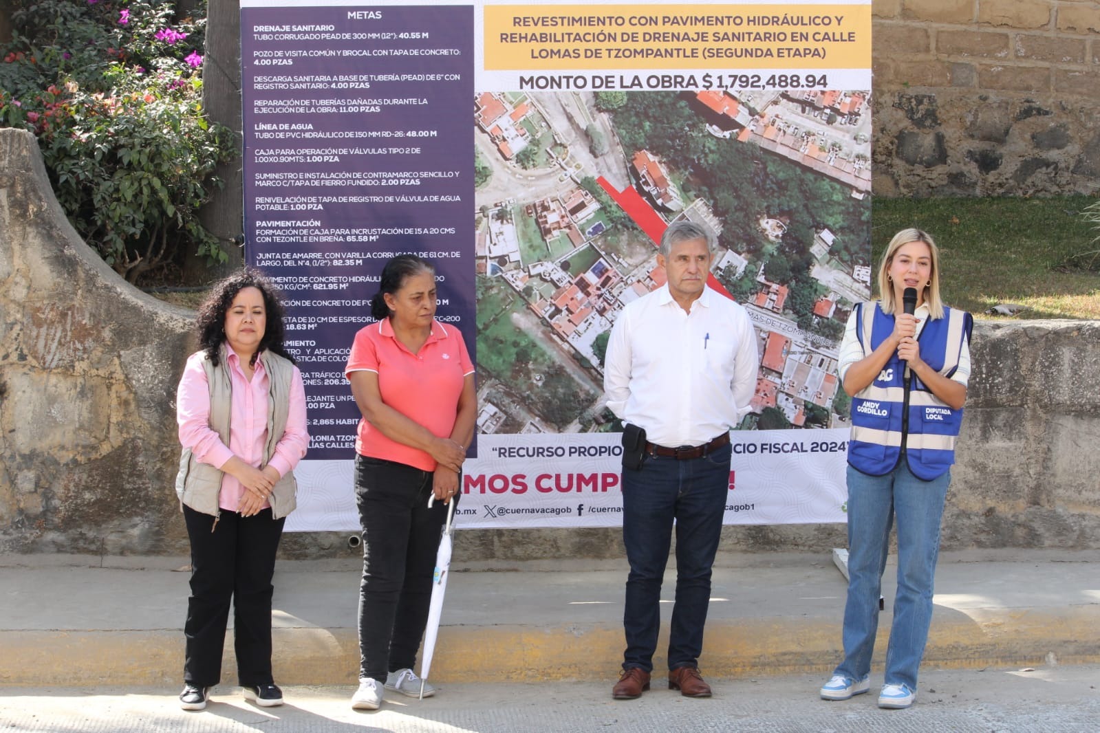 Dando continuidad a la transformación de la zona suroeste de la ciudad, el presidente municipal de Cuernavaca, José Luis Urióstegui Salgado, hizo entrega este martes del revestimiento con pavimento hidráulico y la rehabilitación del drenaje sanitario de la calle Lomas Tzompantle en la colonia del mismo nombre que se suma a la intervención hecha este mismo año en la parte posterior de la arteria que en esta segunda etapa coadyuvará a mejorar la calidad de vida de más de 20 mil habitantes.