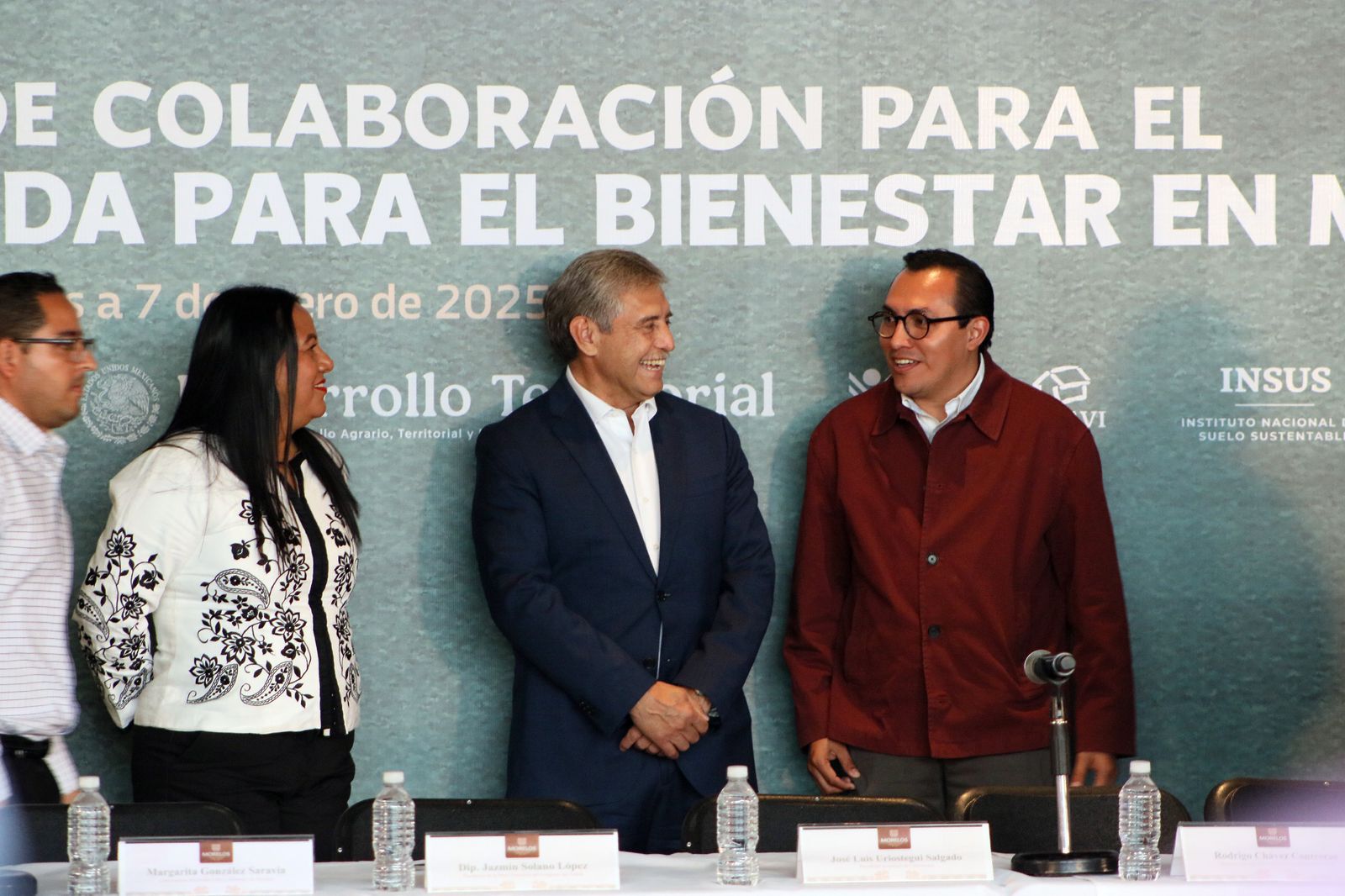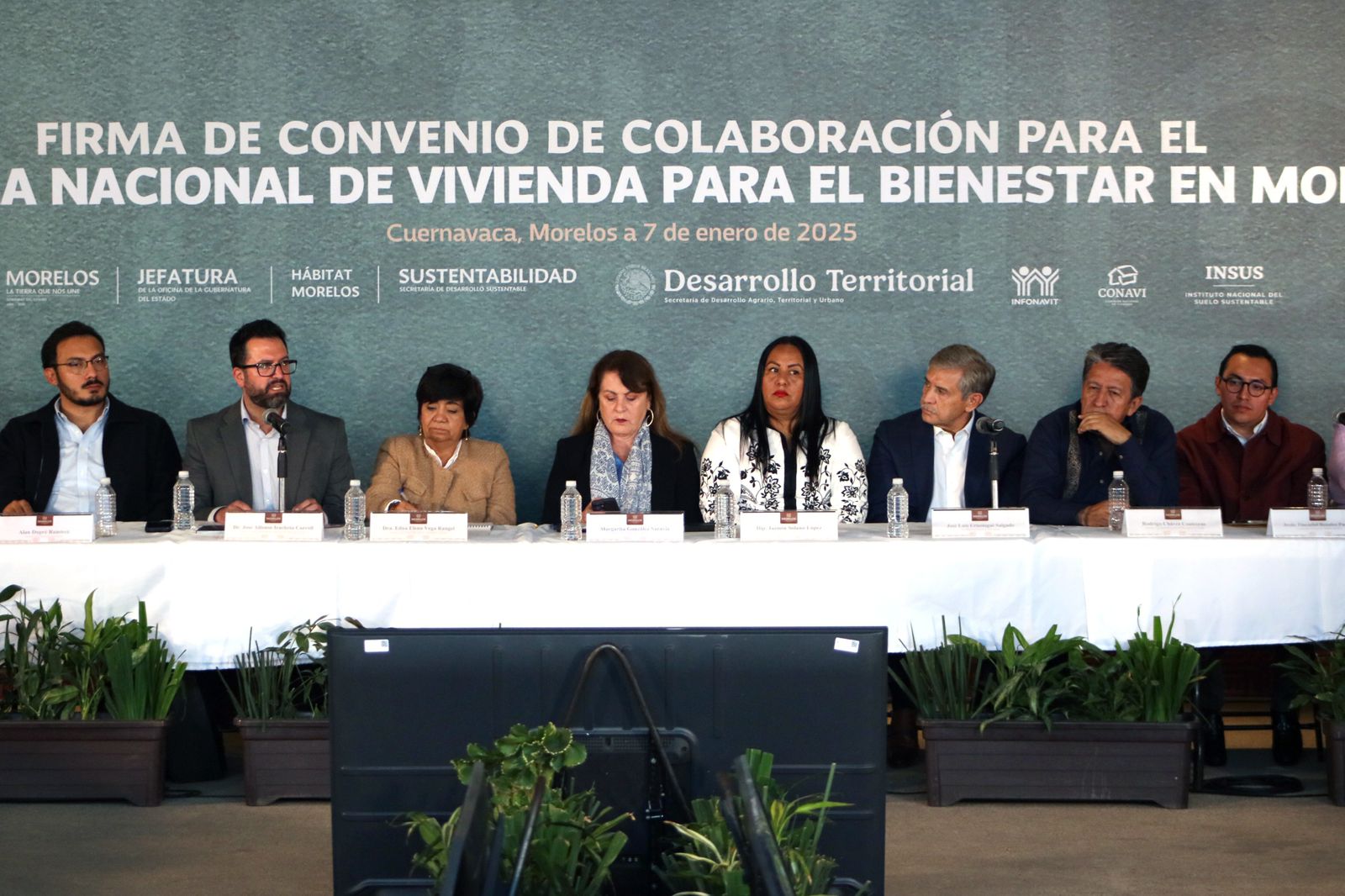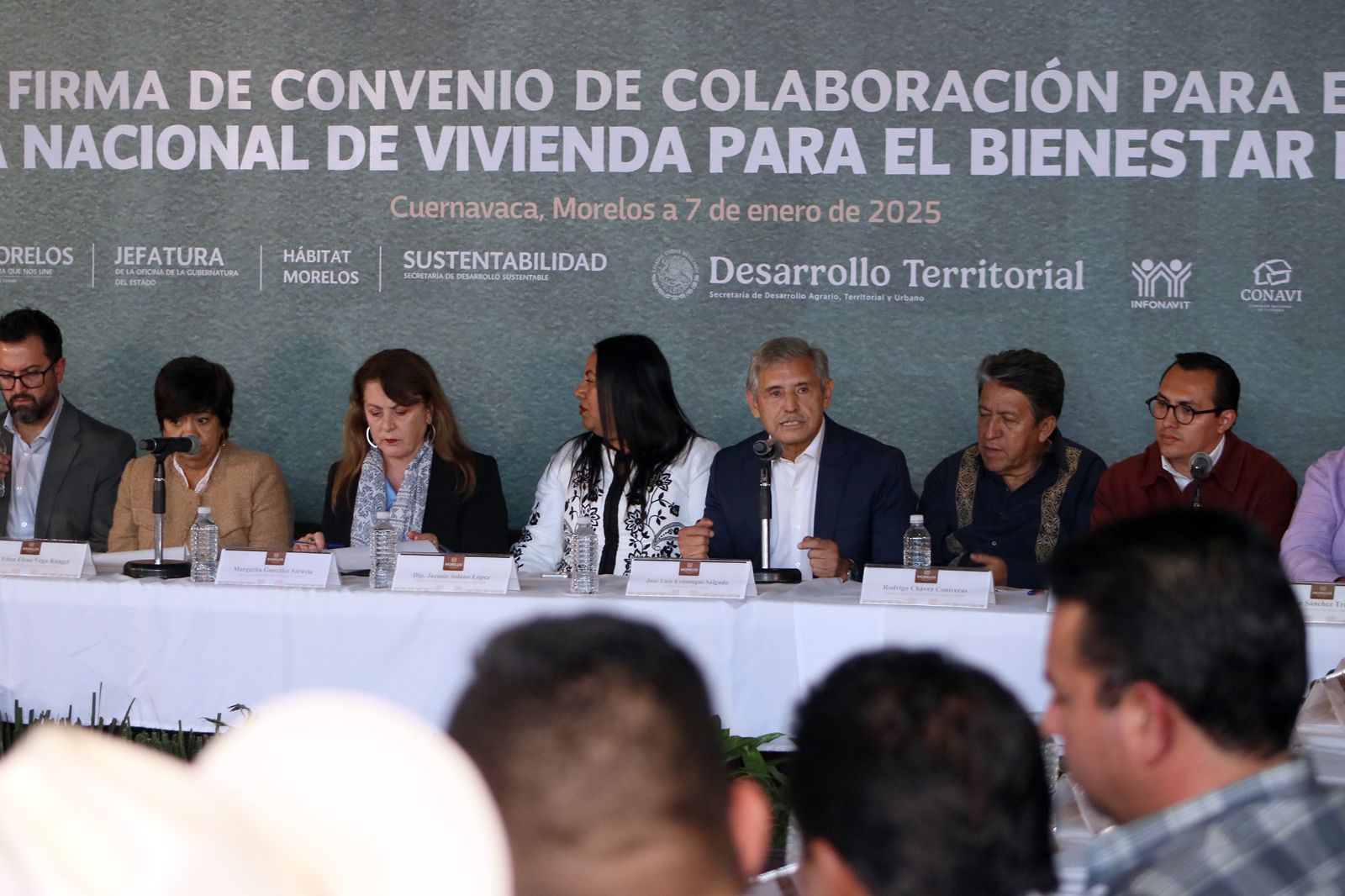 En la firma de convenio participaron Jesús Rosales Puebla, coordinador técnico del programa Hábitat Morelos; Edna Elena Vega Rangel, secretaria de Desarrollo Agrario Territorial y Urbano; José Alfonso Iracheta Carroll, director general del Instituto Nacional del Suelo Sustentable y Rodrigo Chávez Contreras, director general de la Comisión Nacional Vivienda.