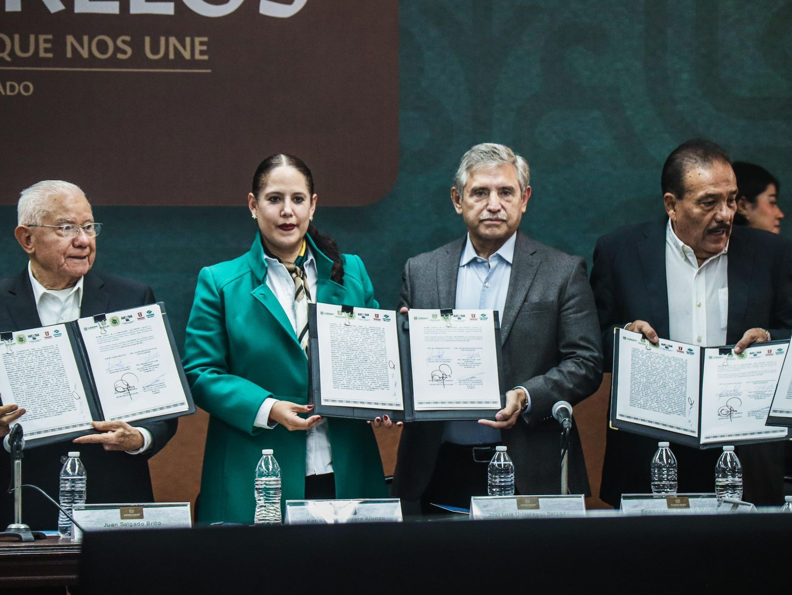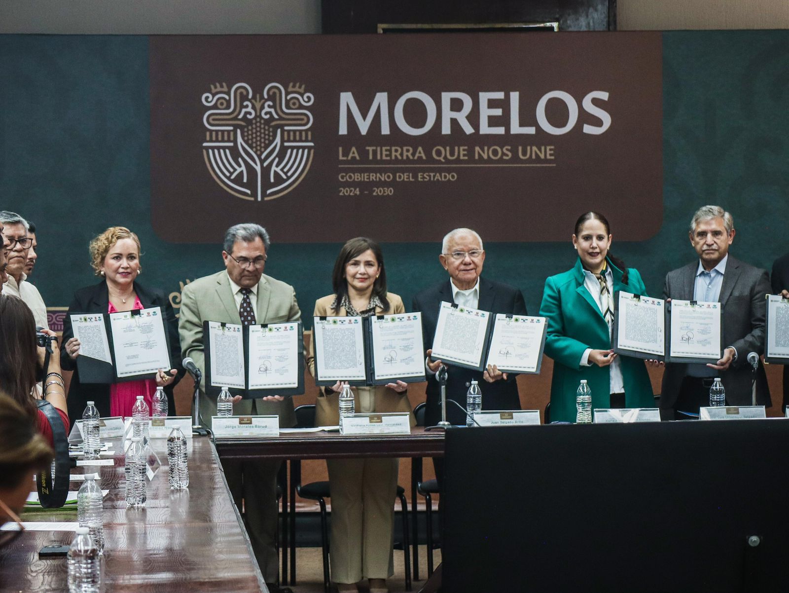 La firma de convenio estuvo encabezada por Juan Salgado Brito, secretario de Gobierno; Viridiana Aydeé León Hernández, rectora de la UAEM; Karla Aline Herrera