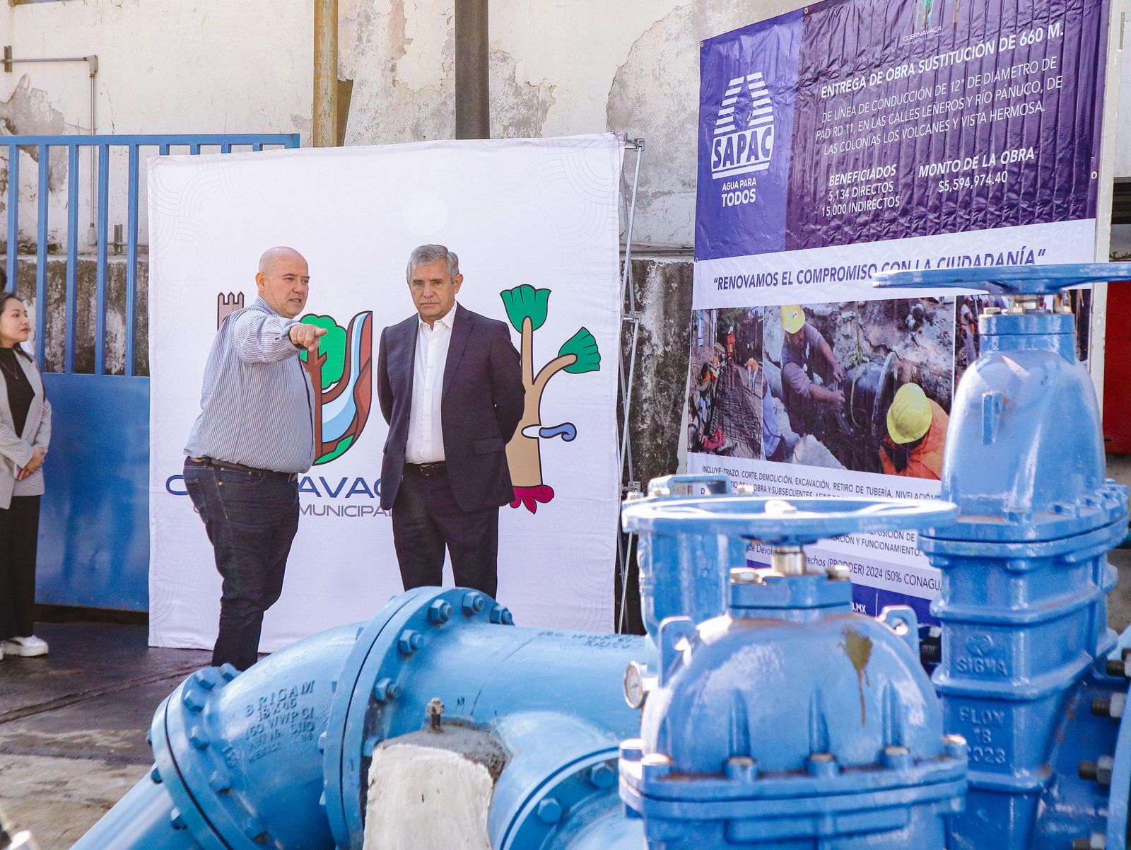Con una inversión de cinco millones 594 mil 974 pesos, el presidente municipal de Cuernavaca, José Luis Urióstegui Salgado, entregó la obra de sustitución de 660 metros de la línea de conducción de 12 pulgadas de diámetro, en las calles Leñeros y Río Pánuco de las colonias Volcanes y Vista Hermosa, que permitirá optimizar la distribución del agua potable y garantizar un servicio más eficiente y de mayor calidad para más de 15 mil habitantes.