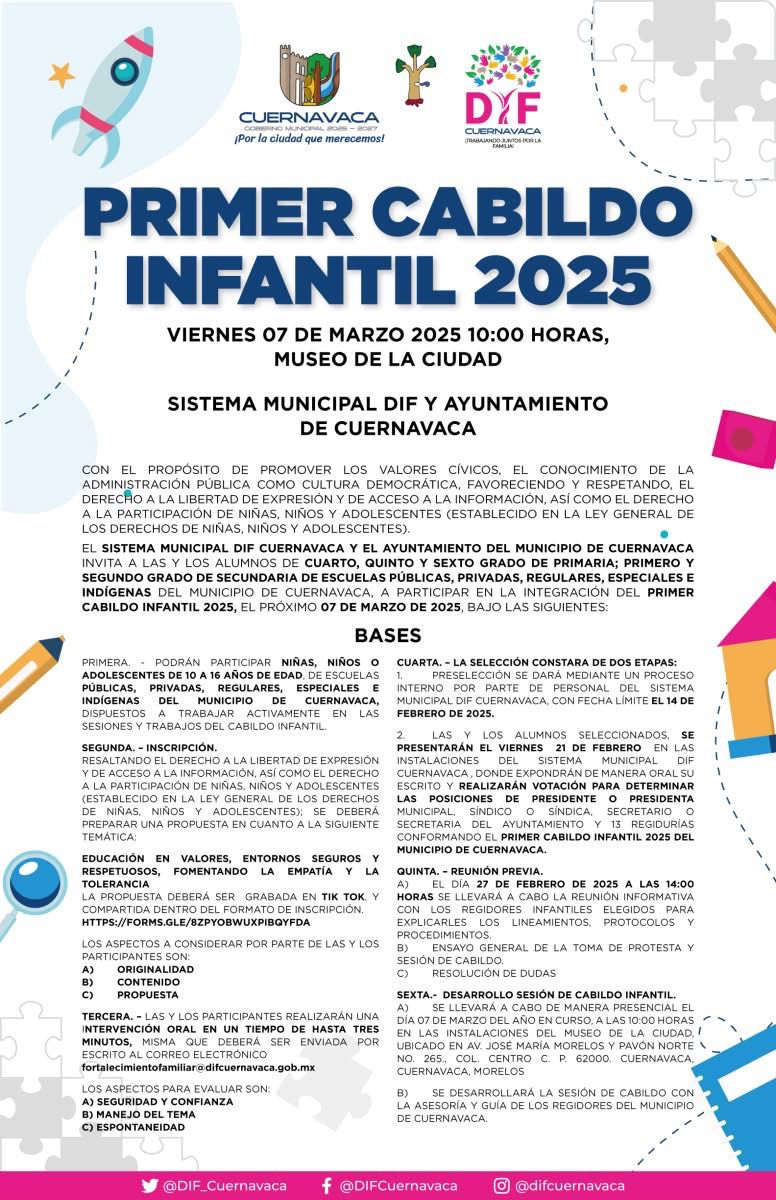 El Ayuntamiento de Cuernavaca, a través del Sistema Municipal DIF, invita a niñas, niños y adolescentes cuernavaquenses de 10 a 16 años a ser parte del Primer Cabildo Infantil 2025, un espacio donde podrán compartir ideas, propuestas y debatir sobre temas que impactan directamente en su entorno, promoviendo a su vez, la construcción de ciudadanía y fomentando el ejercicio democrático desde temprana edad.