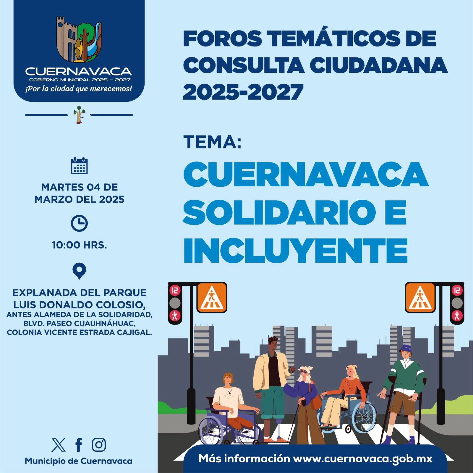 Con el objetivo de construir una ciudad más justa, equitativa e inclusiva para todos sus habitantes, el Ayuntamiento de Cuernavaca, encabezado por José Luis Urióstegui Salgado, continuará este martes 04 de marzo los Foros de Consulta Ciudadana para el Plan Municipal de Desarrollo 2025- 2027, con el tema central “Cuernavaca Solidario e Incluyente”.
