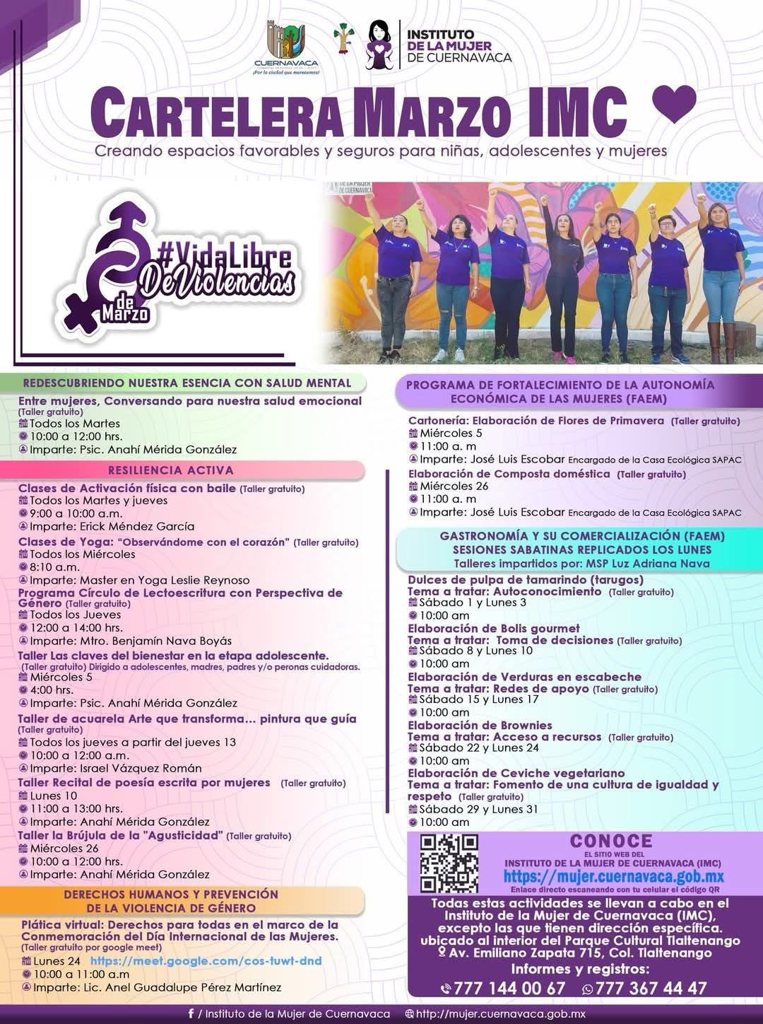 Para mayores informes, consultar la Cartelera de Marzo en el Facebook del Instituto de la Mujer de Cuernavaca, el sitio web: https://mujer.cuernavaca.gob.mx comunicarse al teléfono directo 777 144 00 67, enviar mensaje al WhatsApp 777 367 44 47 o bien, acudir a la sede del IMC de av. Emiliano Zapata 715, colonia Tlaltenango.