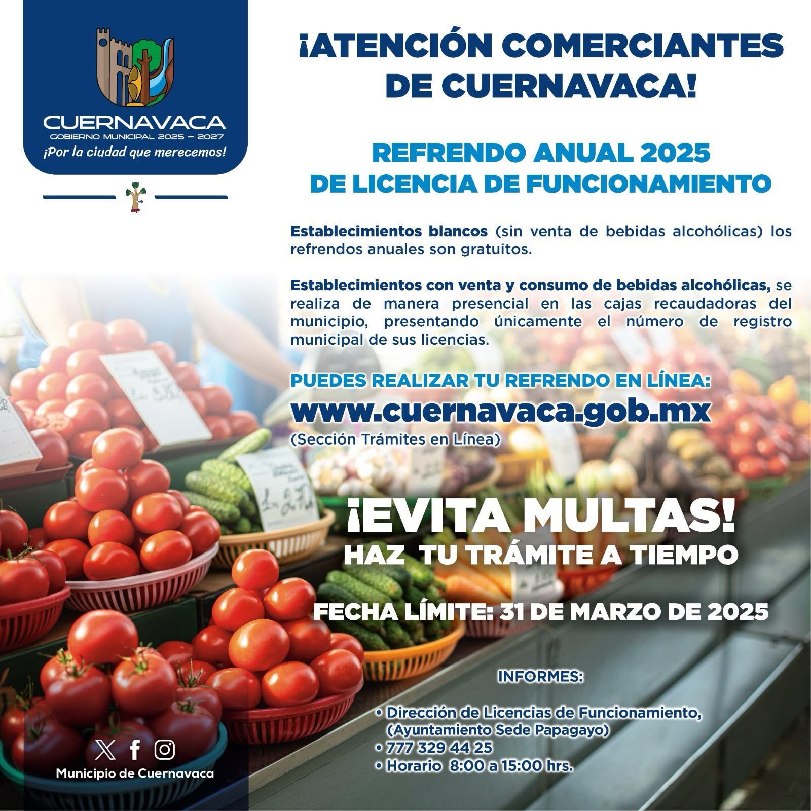 Cabe mencionar que para acceder a este estímulo fiscal deben dirigirse a la Dirección de Licencias de Funcionamiento, ubicada al interior de la sede Papagayo del Ayuntamiento de Cuernavaca, ya que en caso de incumplimiento en cuanto al refrendo se comenzarán a emitir las multas correspondientes.