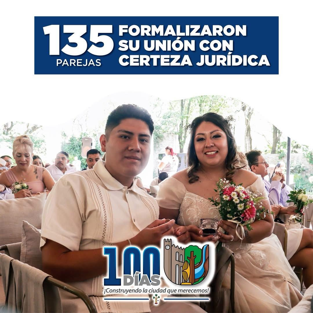 Con el propósito de otorgar certeza jurídica a las parejas y consolidar el núcleo básico de la sociedad, en estos 100 días, el Sistema DIF Cuernavaca realizó la primera campaña de matrimonios colectivos bajo el lema “Sí, acepto”, beneficiando a 135 parejas que se sumaron a las 682 que del año 2022 a la fecha han formalizado su unión legalmente.
