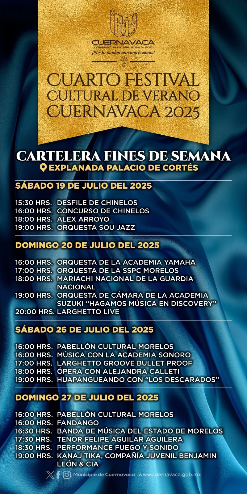 El Cuarto Festival Cultural de Verano Cuernavaca 2025 reafirma el compromiso del gobierno municipal con el acceso libre y gratuito a la cultura, así como con el fortalecimiento del tejido social mediante actividades que promueven la identidad local y la apropiación del espacio público.