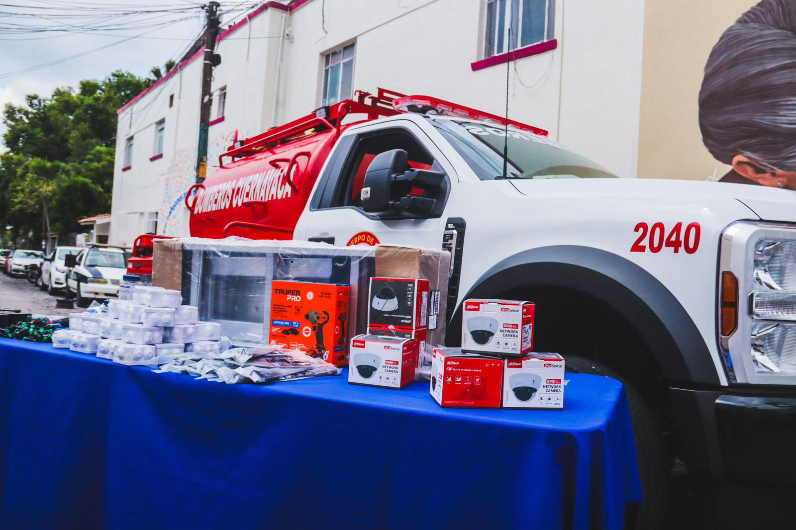Además, de material especializado para el mantenimiento de cámaras de videovigilancia, con el objetivo de fortalecer la capacidad de monitoreo y la prevención del delito. Asimismo, se incorporó un vehículo Pipa de combate tipo cisterna modelo 2025, con capacidad de cuatro mil litros, equipado con un sistema integral de bomba portátil de alto volumen y presión. Este camión de ataque rápido está destinado al uso del Cuerpo de Bomberos.