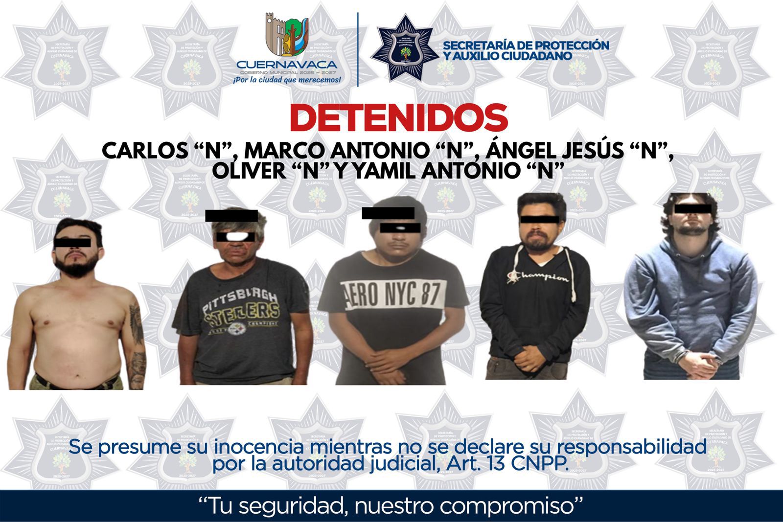 García Delgado pidió a la ciudadanía que, si reconoce o identifica a alguna de las personas detenidas como posible responsable de un delito, realice la denuncia correspondiente ante el Ministerio Público, ubicado en Boulevard Apatlaco número 165, colonia Campo del Rayo, municipio de Temixco, Morelos.