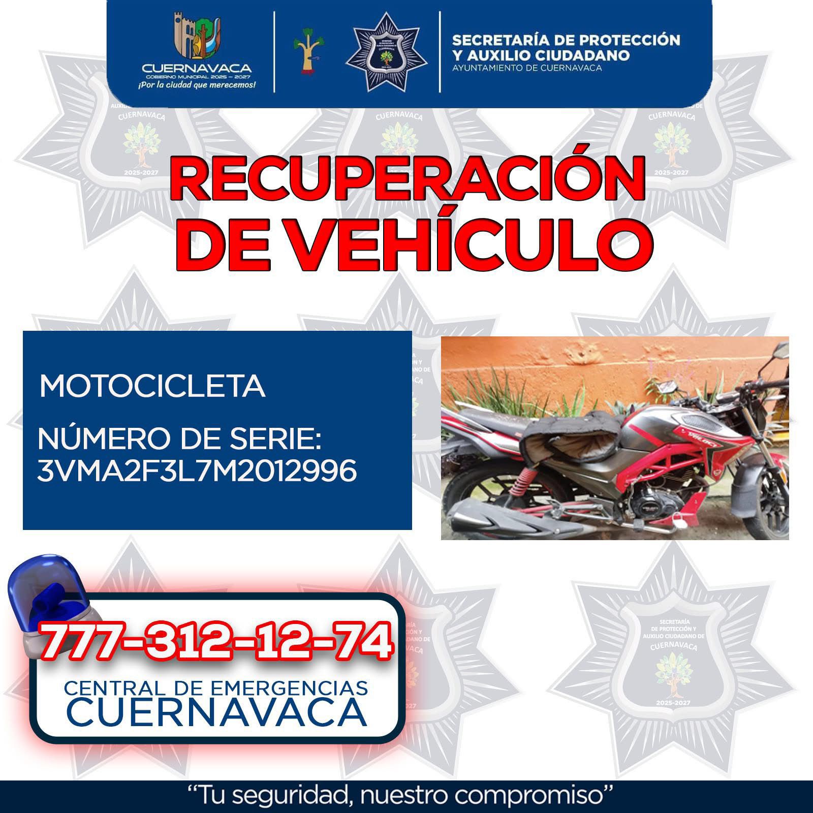 En cuanto a la recuperación de vehículos, como resultado de los operativos de vigilancia y prevención del delito en Cuernavaca, la SEPRAC recuperó, entre otros, un vehículo Ibiza color blanco, modelo 2016, con placas HCR845G y número de serie VSSAB46J1GR021983, reportado como robado en la colonia Chamilpa.