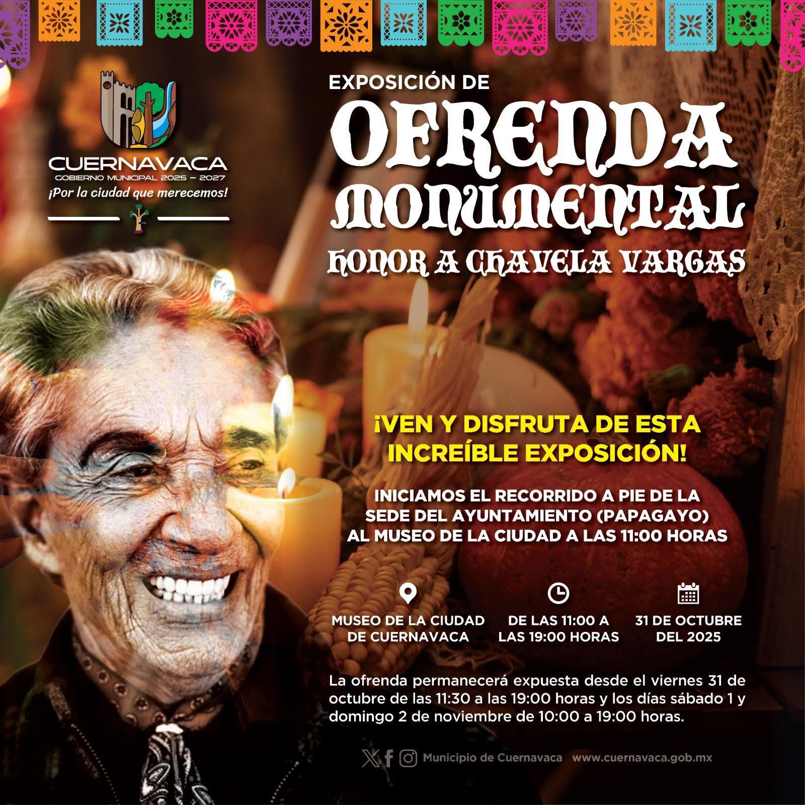 “El 31 de octubre tendremos una ofrenda monumental en honor a Chavela Vargas, y como este año celebramos el Año Internacional de la Mujer, queremos rendir homenaje a una figura muy emblemática de Cuernavaca. Esta ofrenda formará parte de las actividades que se llevarán a cabo tanto en el Museo de la Ciudad como en el Centro Histórico, sumándonos a la algarabía que realizará el Gobierno del Estado con el festival Miquixtli”, puntualizó Suárez Gerard.