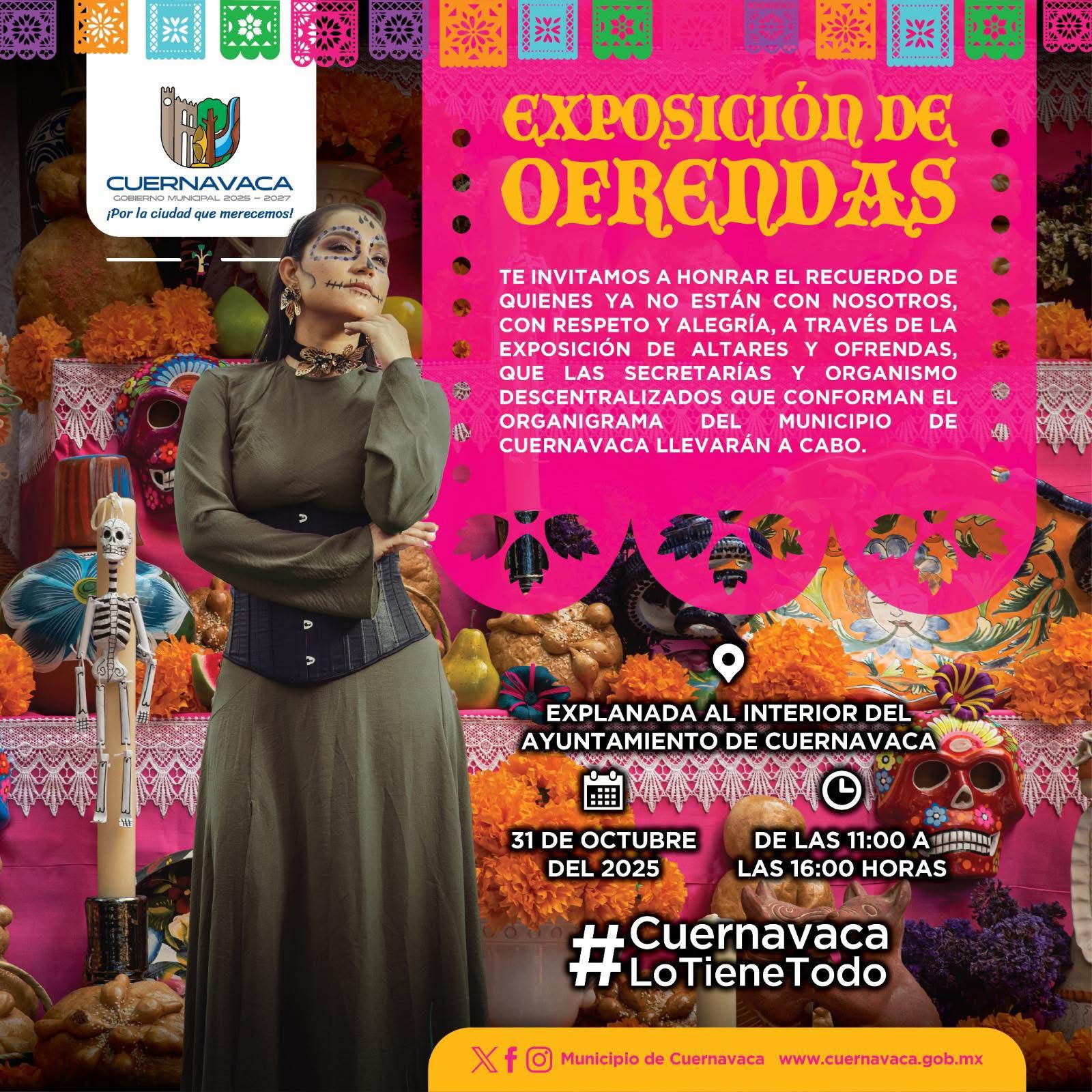 Asimismo, la Secretaría de Desarrollo Humano y Participación Social (SDHyPS) ofrecerá diversas actividades en el Museo de la Ciudad de Cuernavaca (MuCiC), además del Festival de Día de Muertos “Mictlán 2025”, que reunirá arte, música y danza. Entre las actividades destacan un concierto musical en Ocotepec, la exhibición de ofrendas en el Parque Tlaltenango y el Mercadito Incluyente en la sede Papagayo del Ayuntamiento.